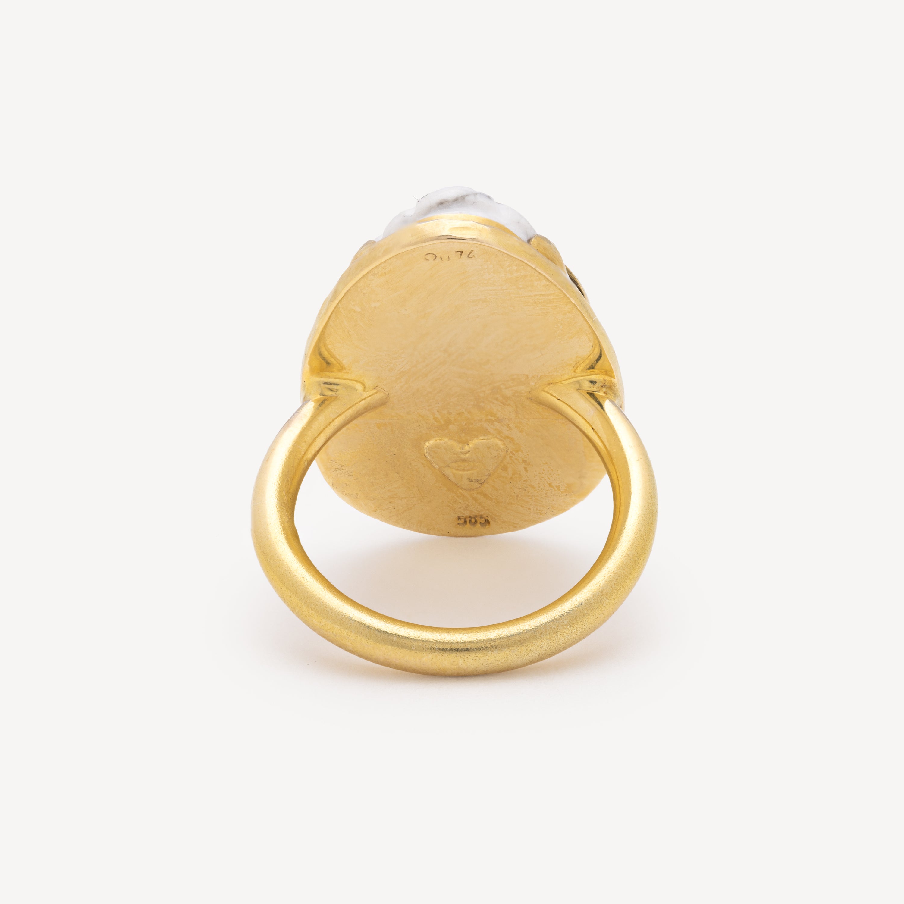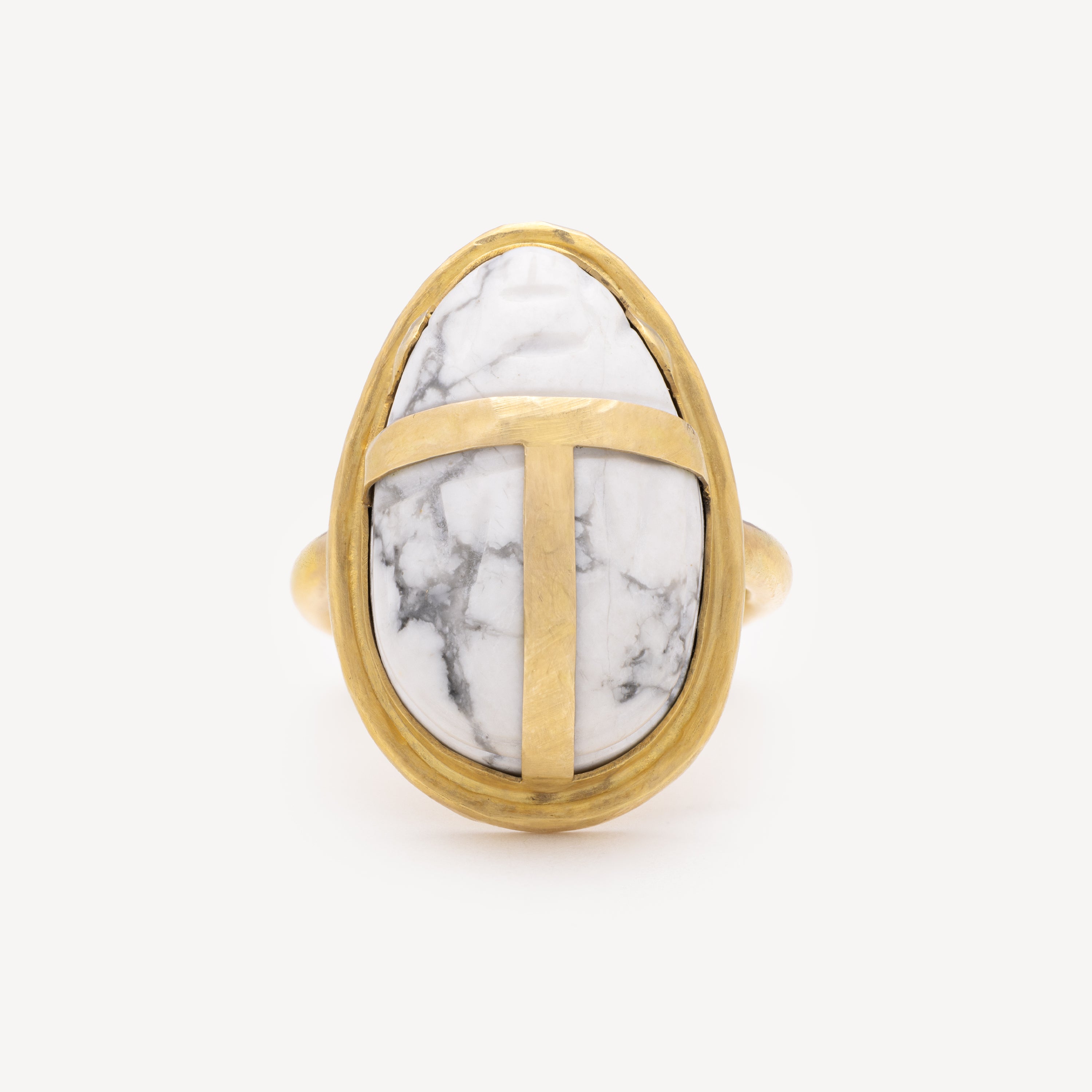 Fabriquée à la main en or jaune 14 carats, cette bague est serti d'un impressionnant scarabée en howlite, pierre du succès, de la confiance en soi et de la méditation.