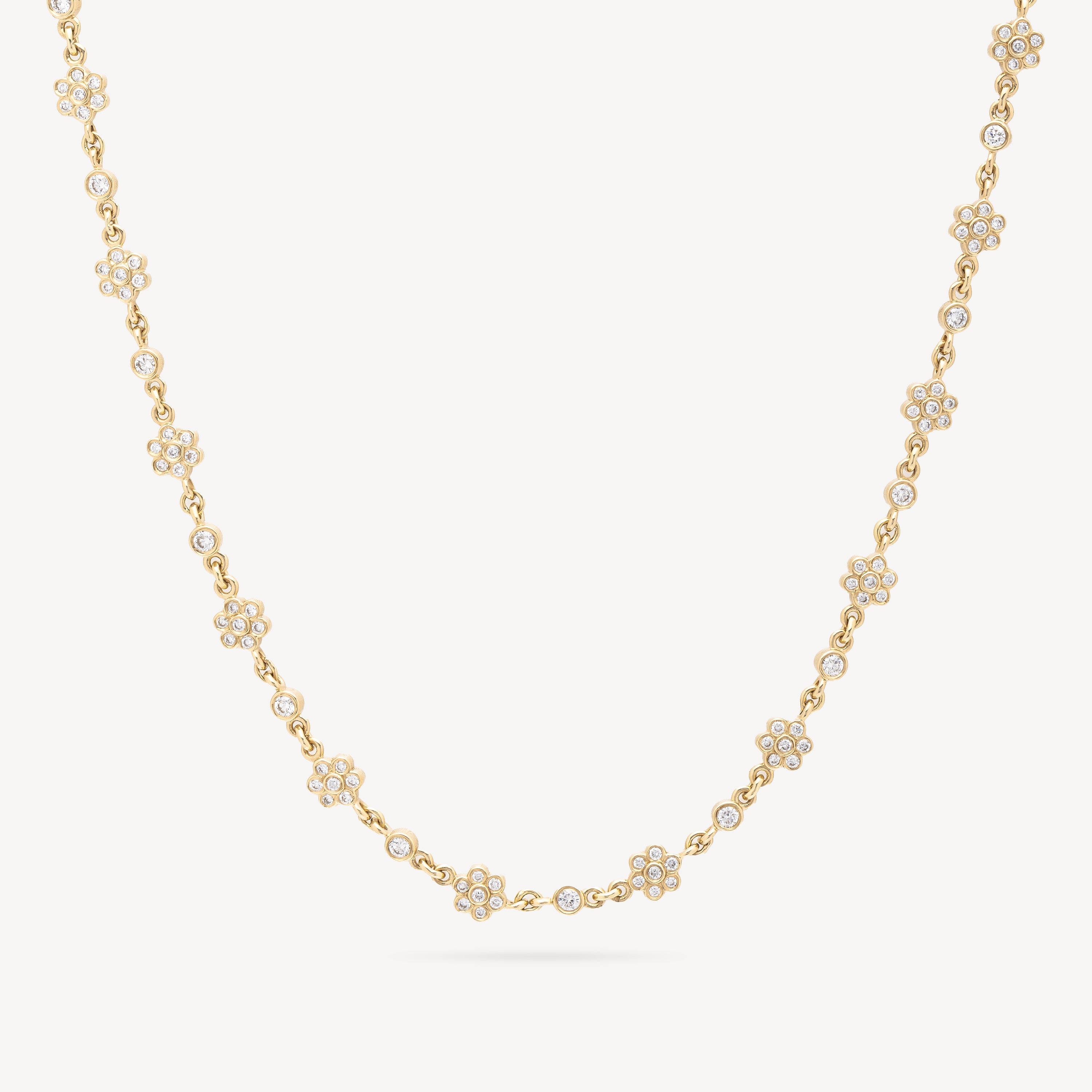 Ce collier Chamomile Tennis Choker est un bijou délicat en or jaune orné de fleurs pavées de diamants.