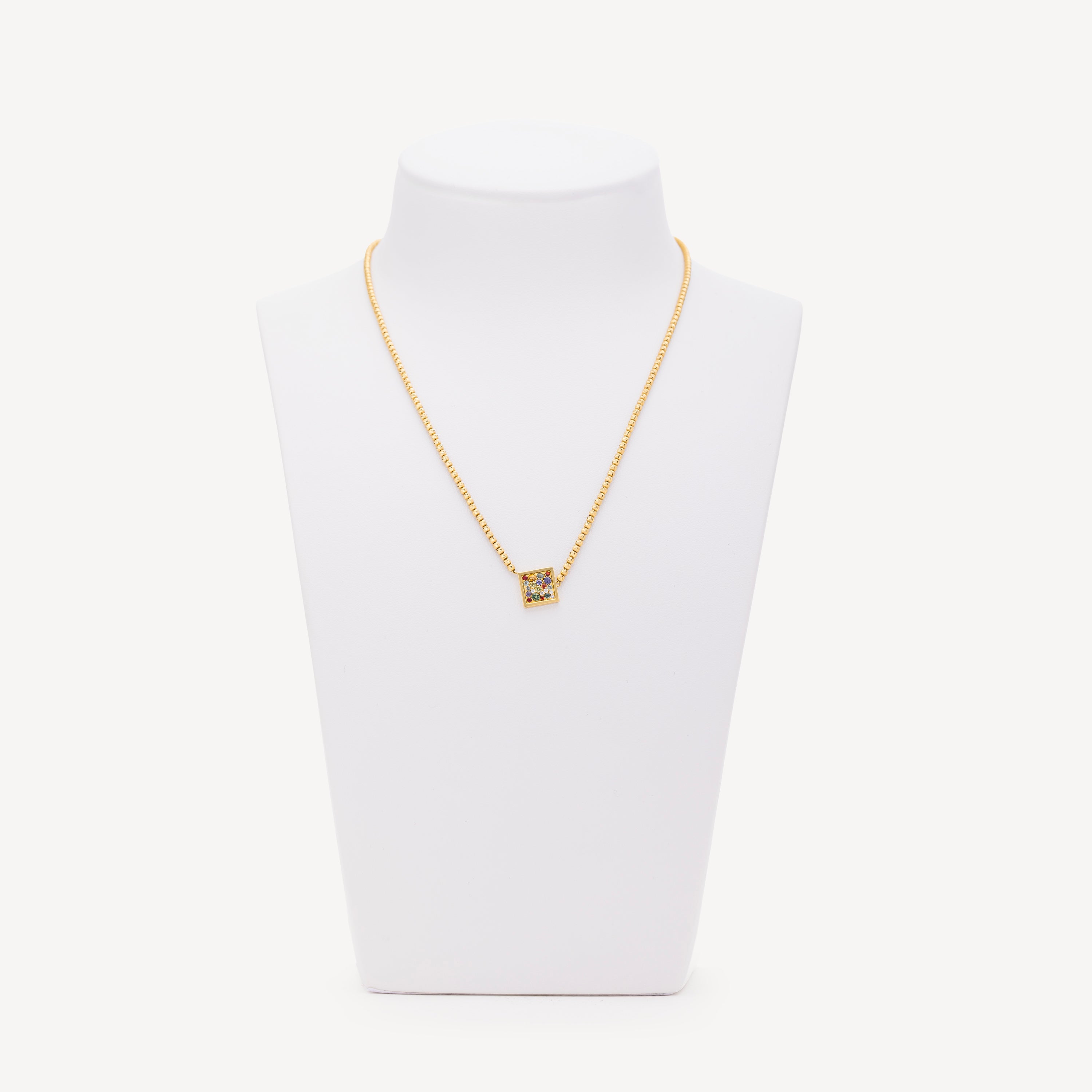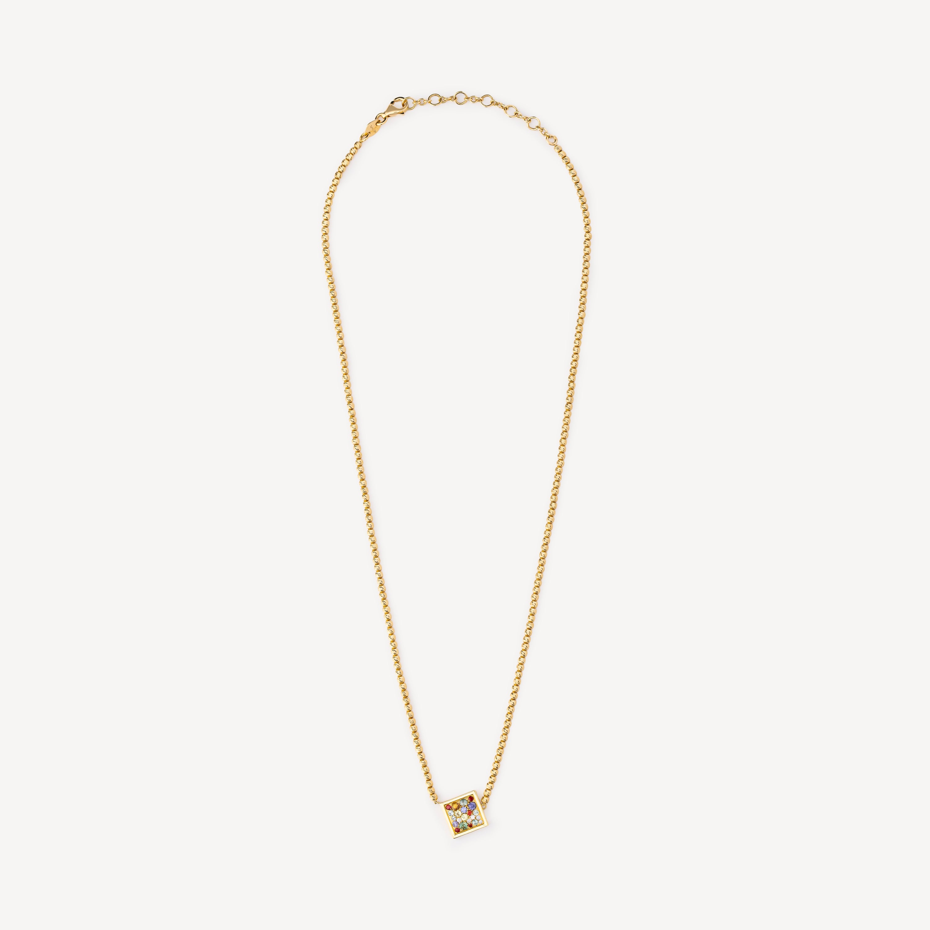 Ce collier élégant en or jaune est orné d'un pendentif carré incrusté de magnifiques saphirs multicolores et de diamants étincelants.
