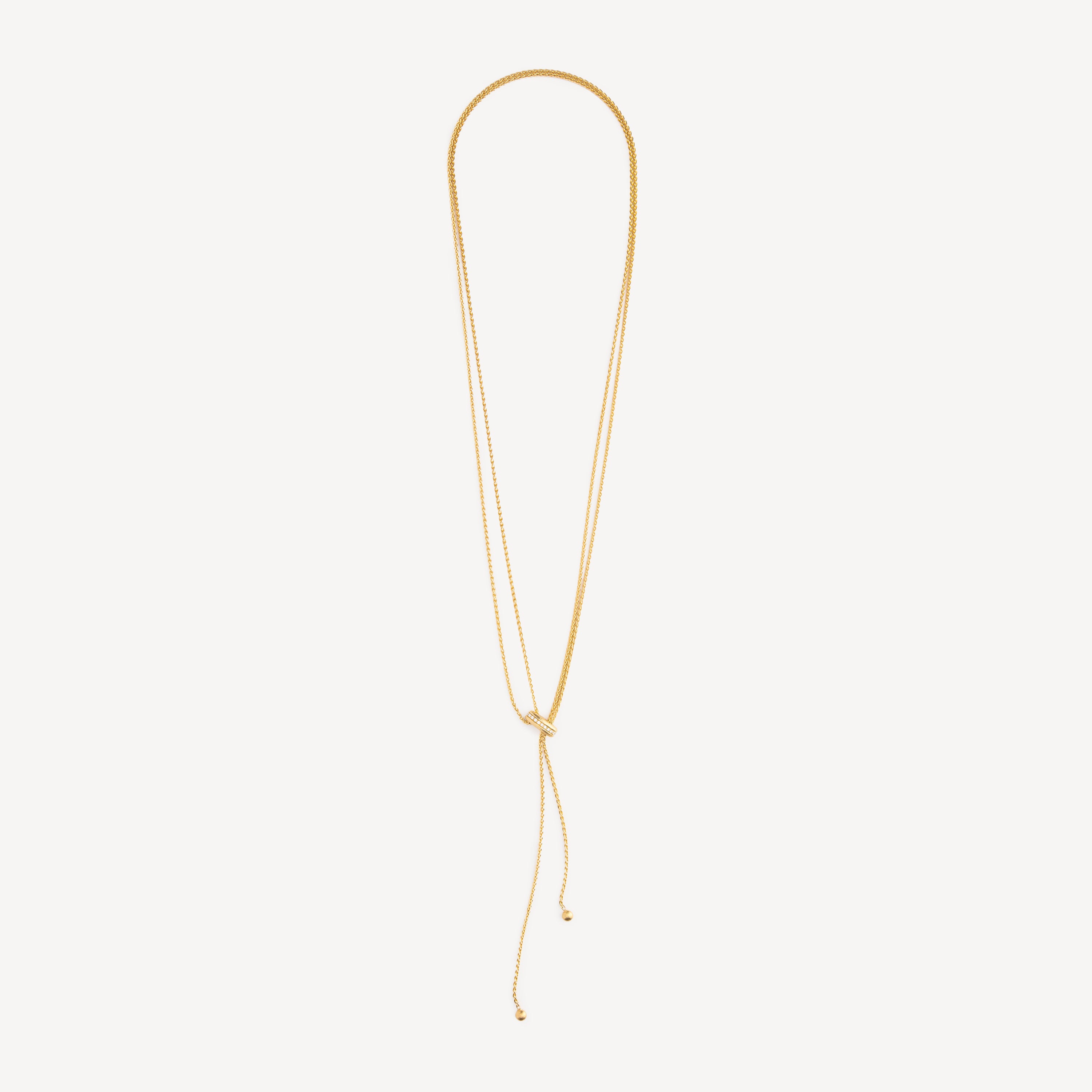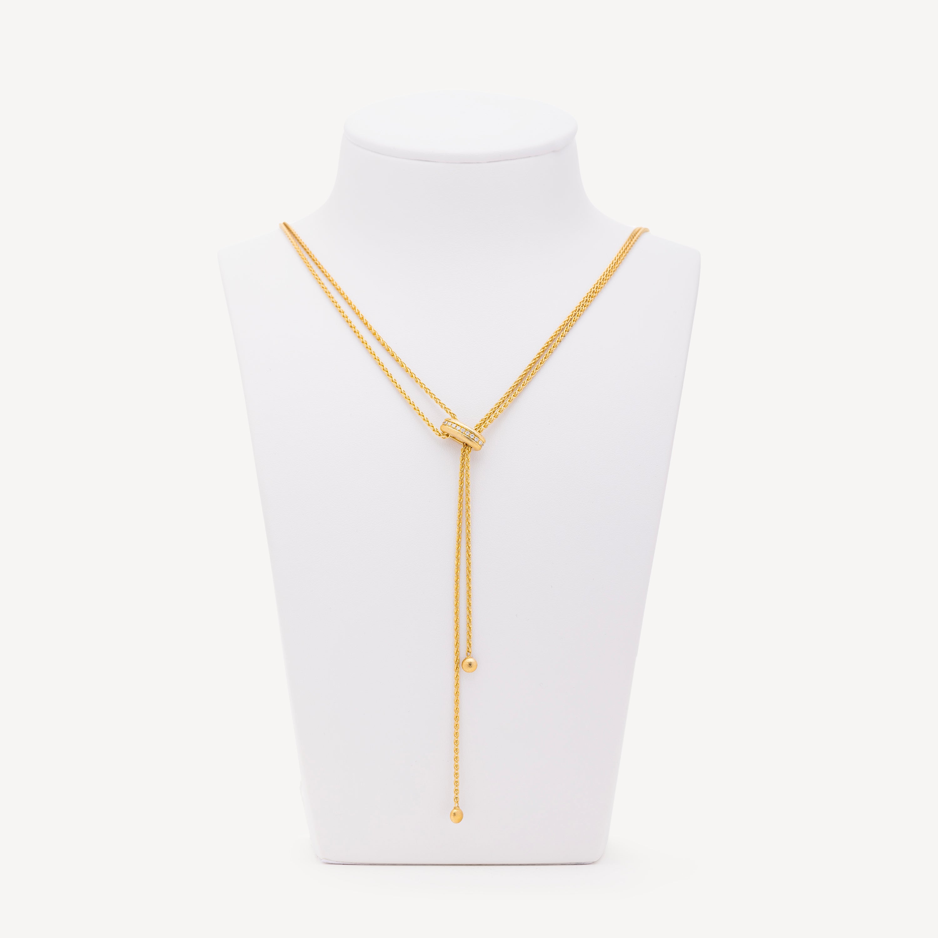 Collier en or jaune 18ct délicatement conçu avec un design ajustable en Y, ce bijou allie finesse et modernité. Son double rang se termine par un élégant fermoir coulissant orné de pavés scintillants, ajoutant une touche lumineuse et sophistiquée à toutes vos tenues.