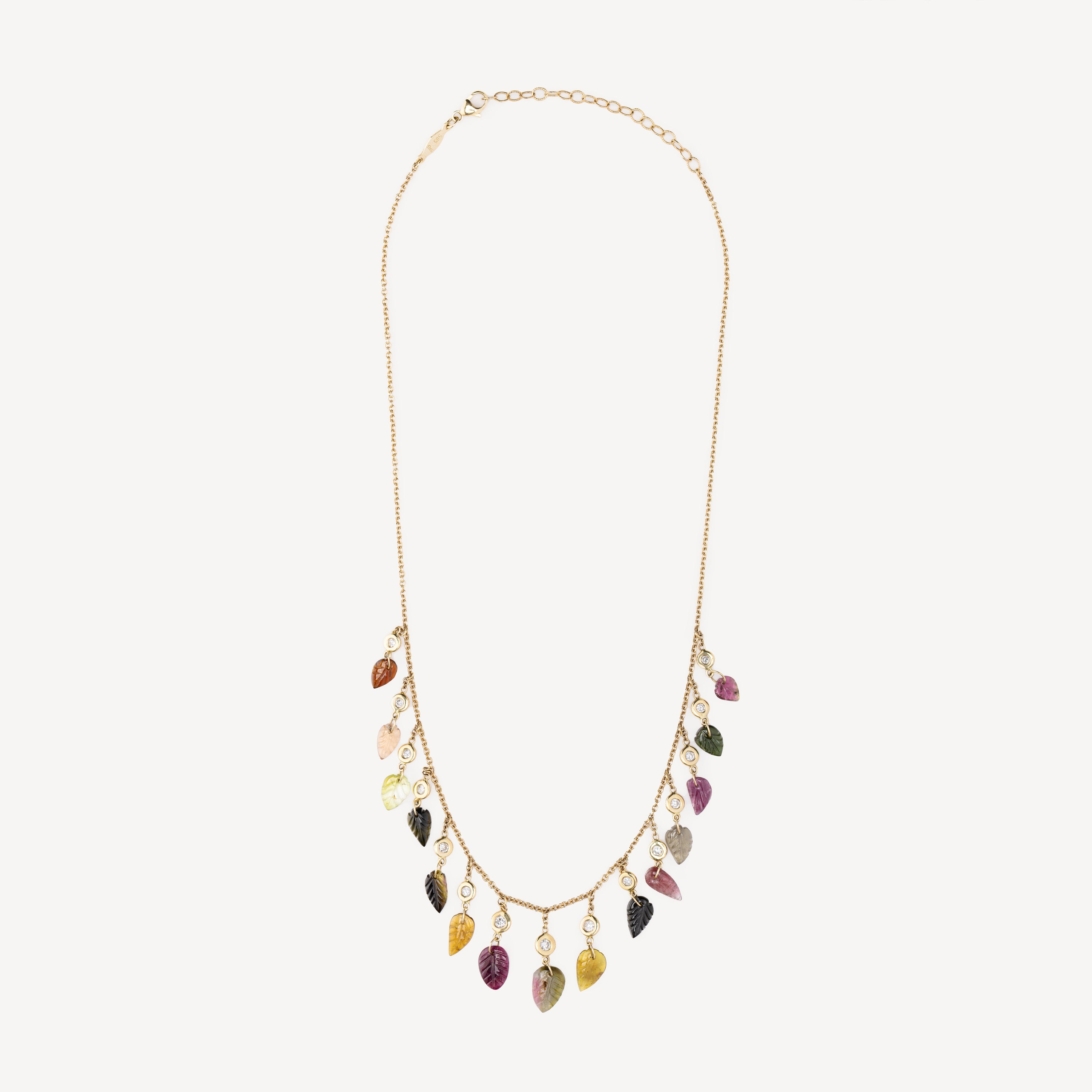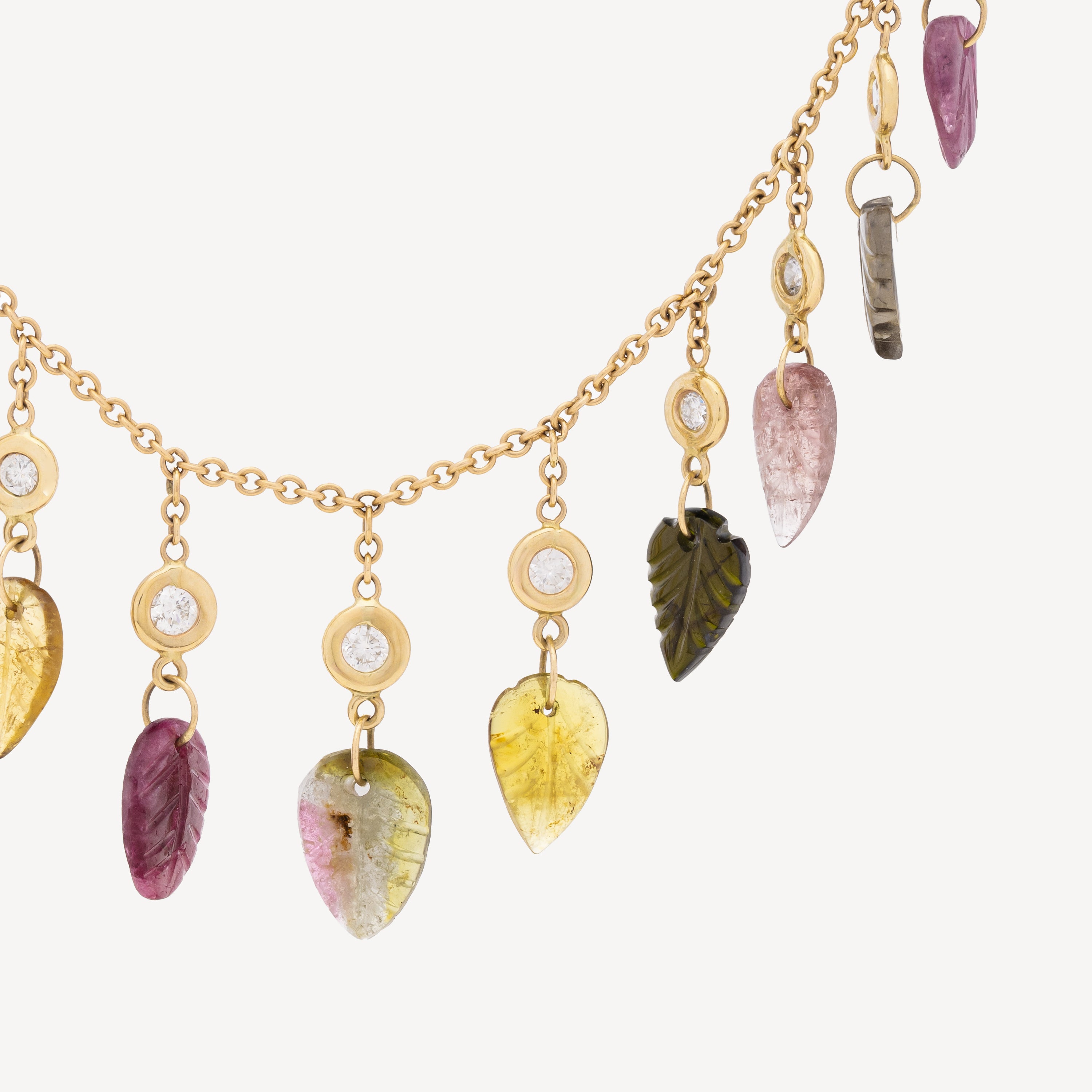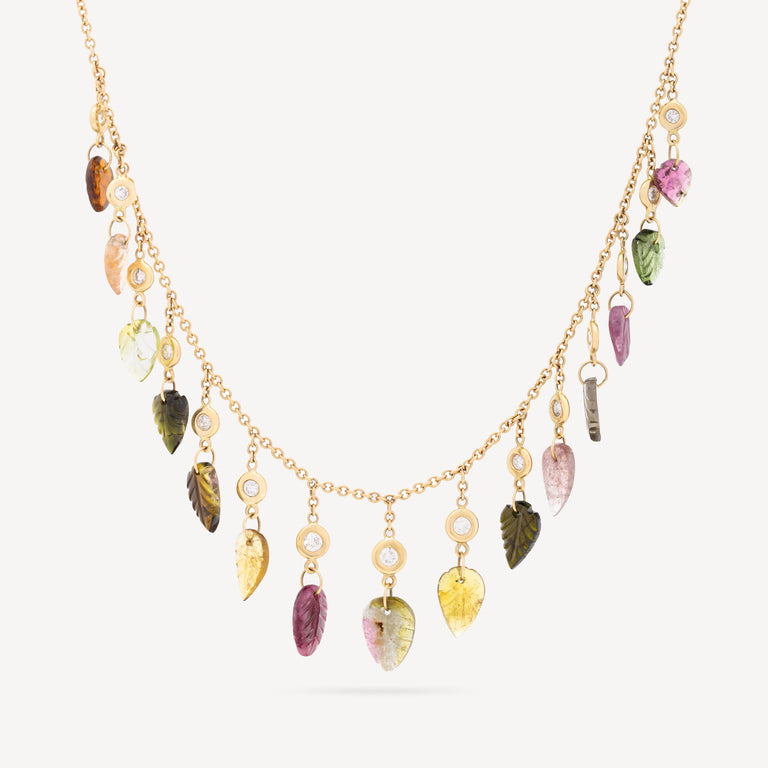Ajoutez une touche d'élégance naturelle avec ce collier en or rose, magnifiquement orné de feuilles sculptées en tourmaline multicolore et de quinze diamants étincelants .