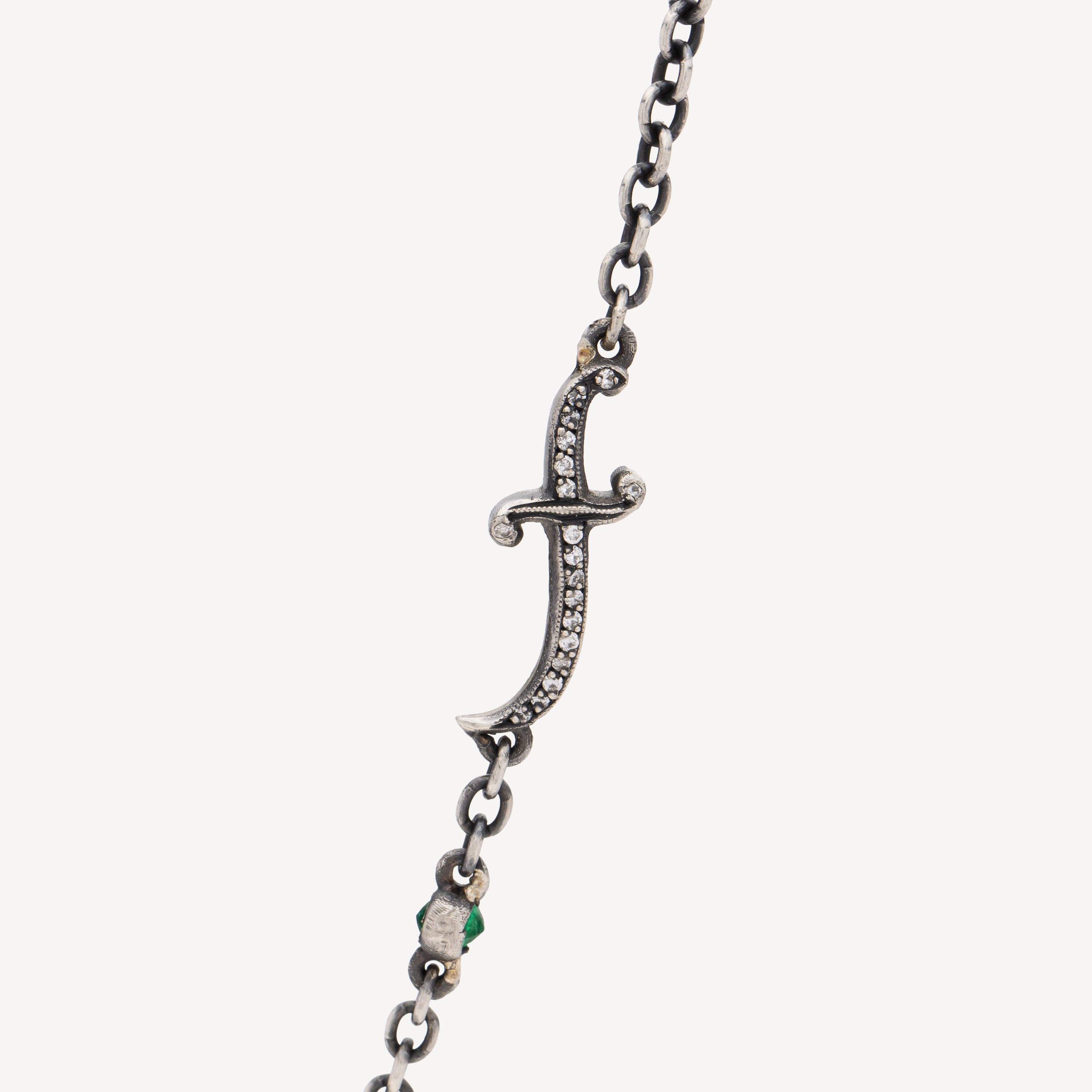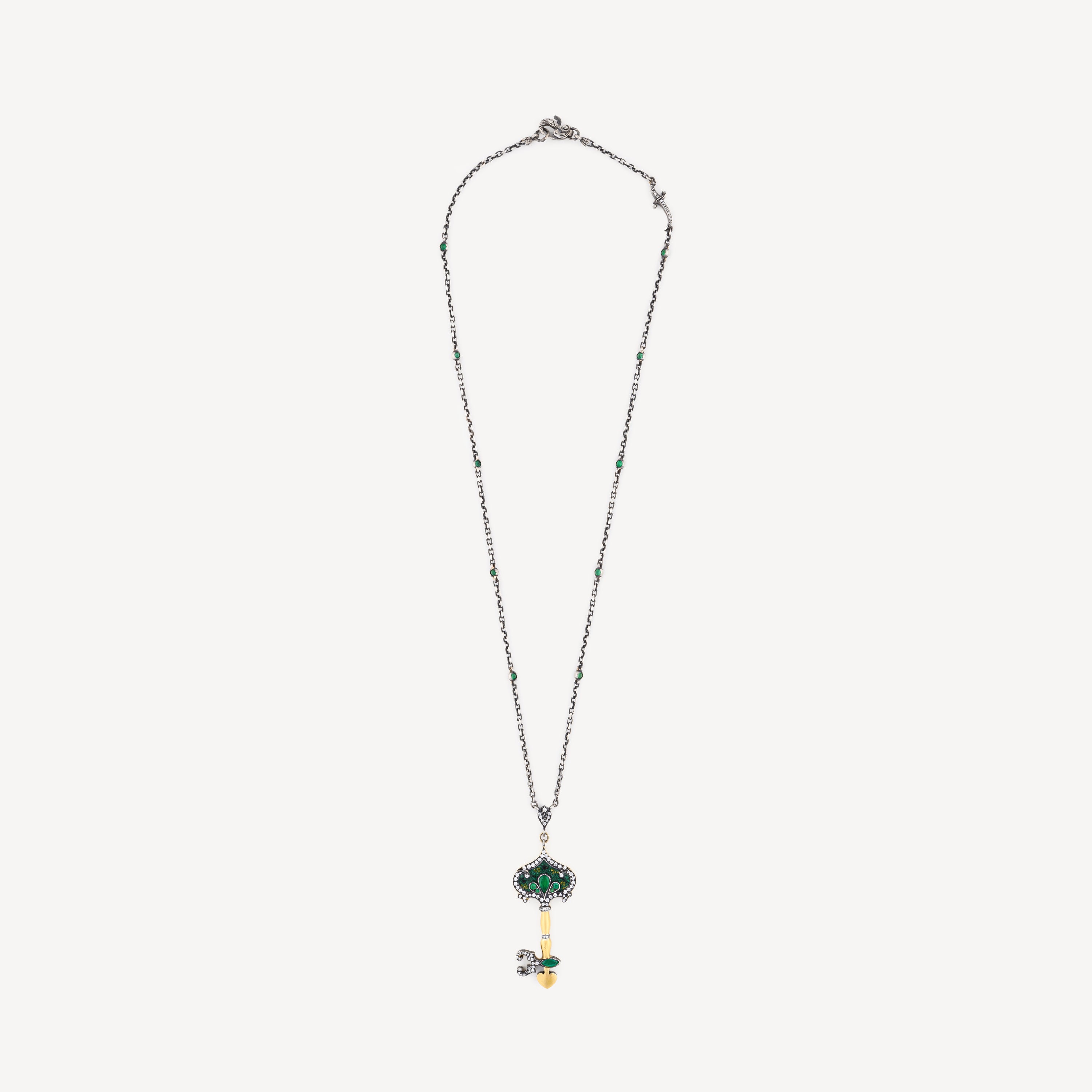 Ce collier en or jaune et argent est tout simplement magnifique. Avec son pendentif en forme de clé, orné de diamants et d'émeraudes, il est à la fois élégant et raffiné.