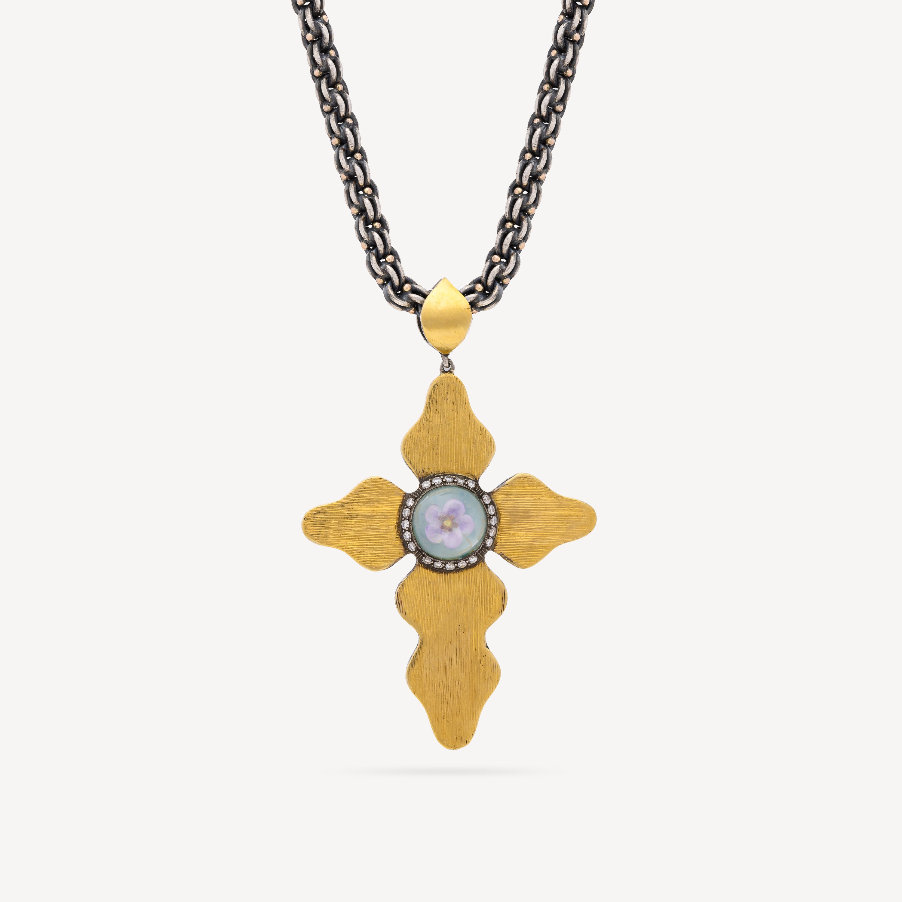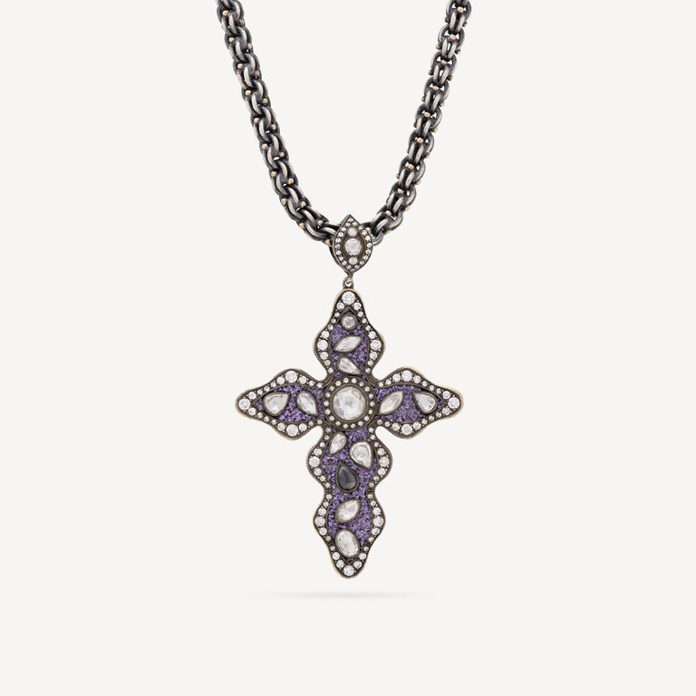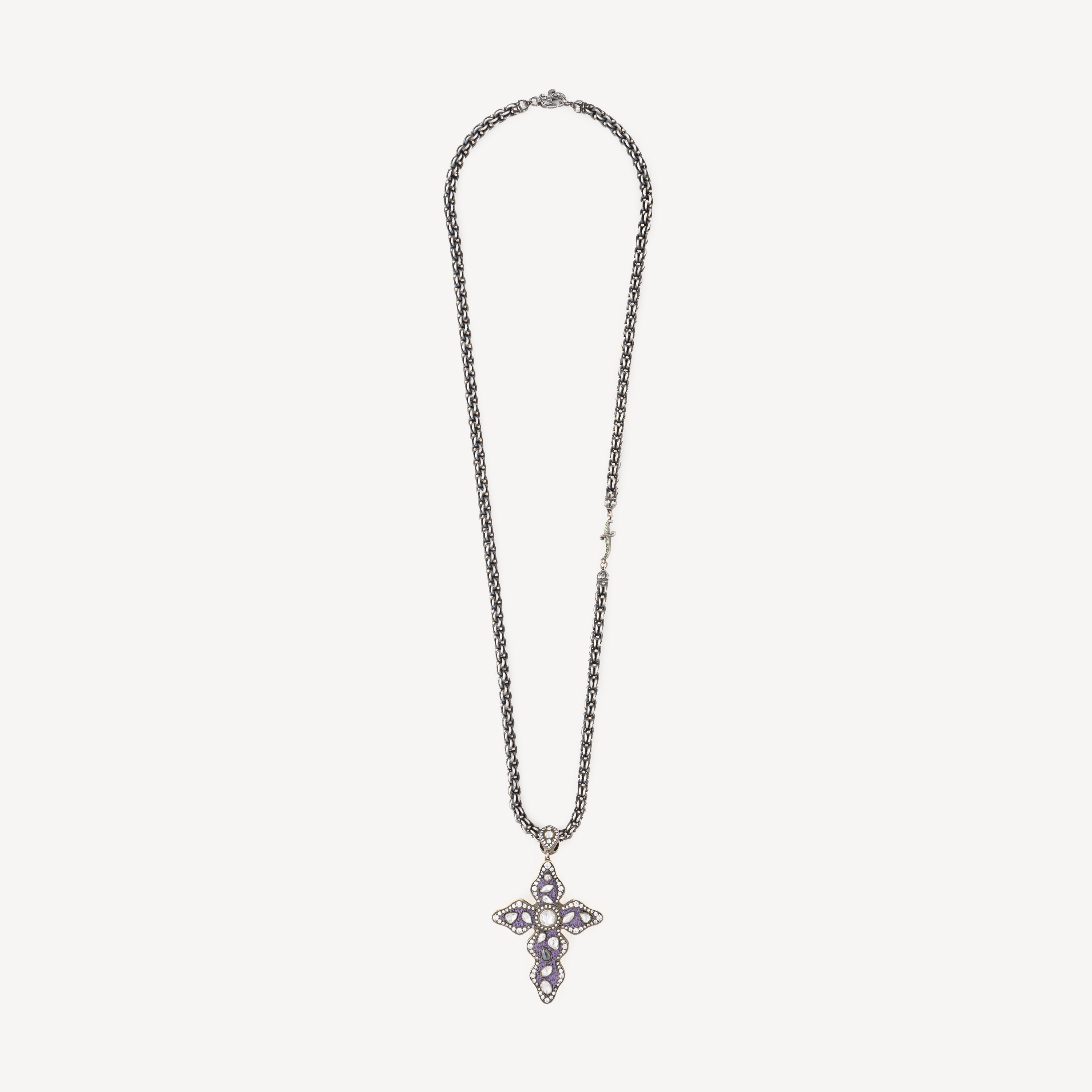 Ce collier élégant combine une chaîne en argent avec un pendentif croix en or jaune serti de diamants et de pierres précieuses. La croix symbolique et les éléments précieux font de ce bijou un choix intemporel.
