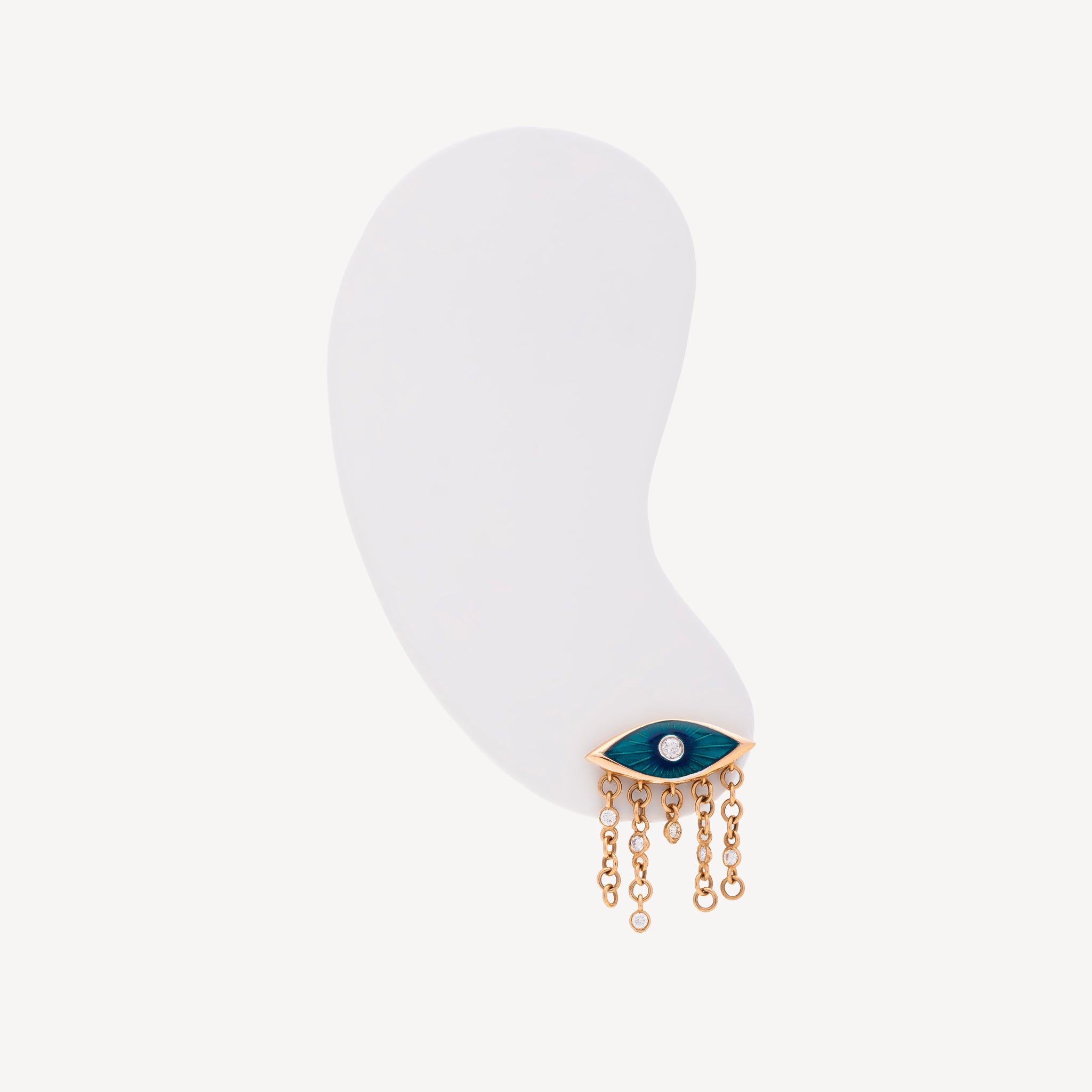 Cette boucle d'oreille Evil Eye Chain en or rose est joliment décorée d'un œil en émail orné de cinq chaines avec diamants blancs.