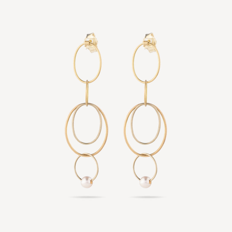 Boucles d’oreilles pendantes avec cercles juxtaposés en or jaune et perle d’eau douce.