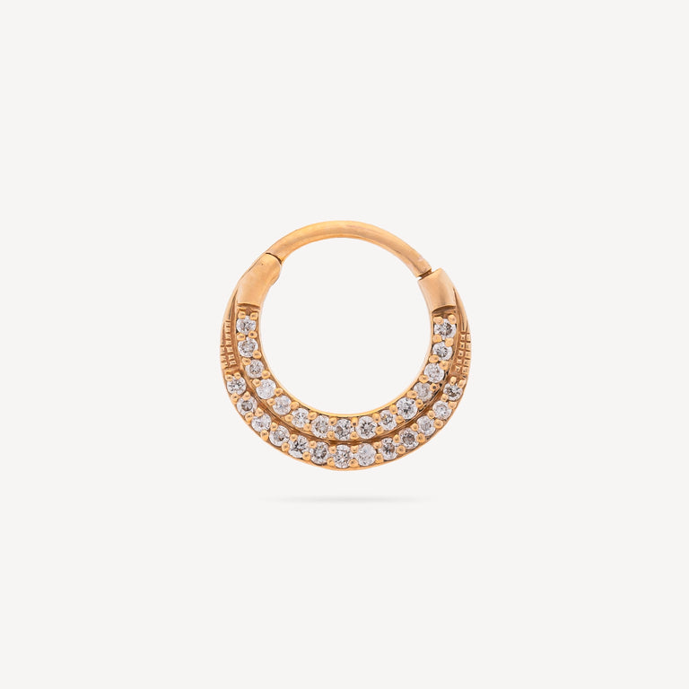 Créole plate de 8 mm en or jaune 18 carats, sublimée par une double ligne de diamants blancs. Une pièce précieuse au design minimaliste, idéale pour illuminer le lobe ou le cartilage avec élégance.