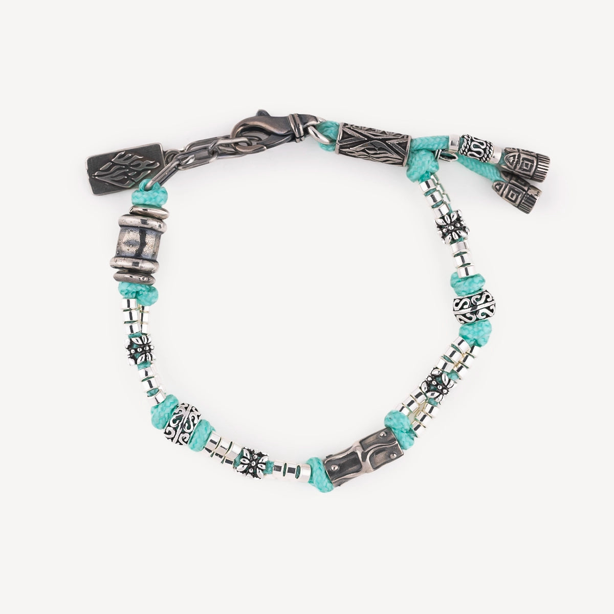 Découvrez le Bracelet Jacob de la Maison Kameart. L’argent, lumineux et sincère, rencontre la profondeur du cordage vert givré dans un dialogue authentique. Pensé comme un bijou de caractère, il se porte près de la peau et accompagne chaque geste, racontant une histoire de force tranquille.