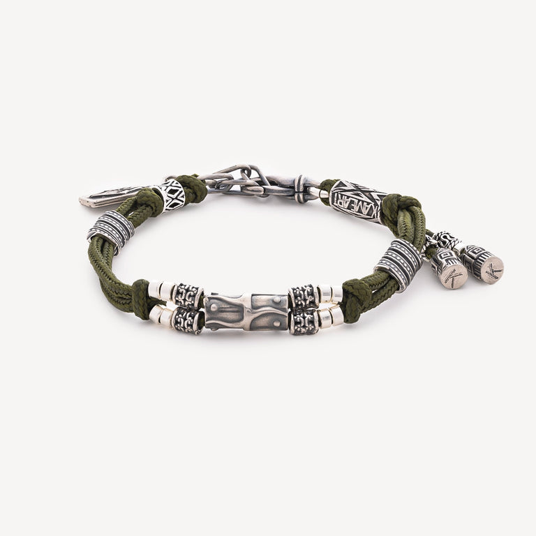 Découvrez le Bracelet Simha de la Maison Kameart. Le cordage kaki, naturel, s’orne de perles en argent finement travaillées, captant la lumière avec douceur. Porté au poignet, ce bijou évoque un lien précieux, intime et sincère.