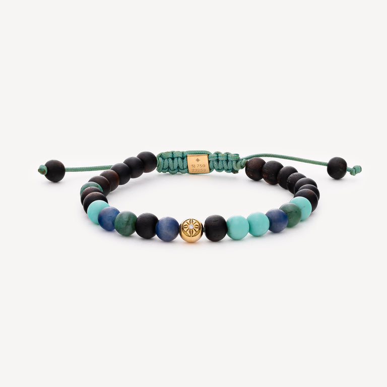 Bracelet monté sur un cordon bleu composé de 29 beads de 6mm et un lock : 1 bead en or jaune avec diamants blancs, 3 beads en saphir bleu, 3 beads en émeraude, 4 beads en turquoise, 18 beads en ébène, et 1 lock en or jaune avec un diamant blanc.