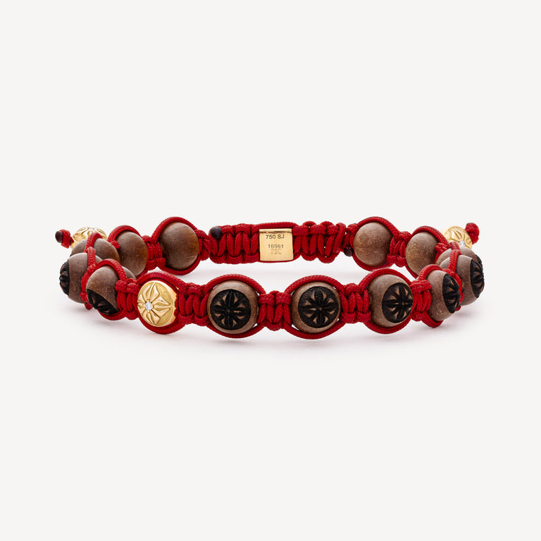 Bracelet monté sur un cordon rouge composé de : 13 bead en ébène, une bead en or jaune ornée de diamants blancs, 1 lock en or jaune orné d’un diamant blanc et 2 beads de 7mm en or jaune ornées d’un diamant blanc.