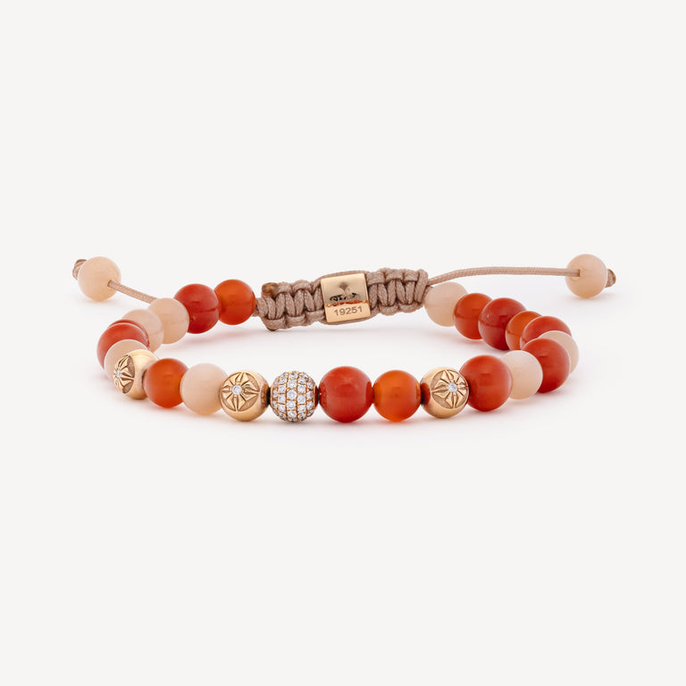 Bracelet monté sur un cordon rose composé de 26 beads et un lock : 9 beads en pierre lune, 7 beads en cornaline, 6 beads corail, 2 beads en or rose serties de 2 diamants, 1 lock en or rose serti d’un diamant blanc, 1 bead or rose sertie d’un diamant ainsi qu’une bead en rose rose pavée de diamants.