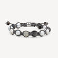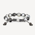 Bracelet monté sur un cordon gris composé de 14 beads et 1 lock : 6 beads en saphir gris, 5 beads en céramique argentée, 1 bead en pierre de lune, 2 beads en or blanc serties de deux diamant blancs, et un lock en or blanc serti d’un diamant blanc.