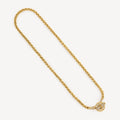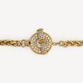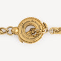 Collier sautoir vintage en métal finition dorée avec grand fermoir en T orné de cristaux clairs. Peut également se porter en ceinture.
