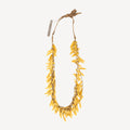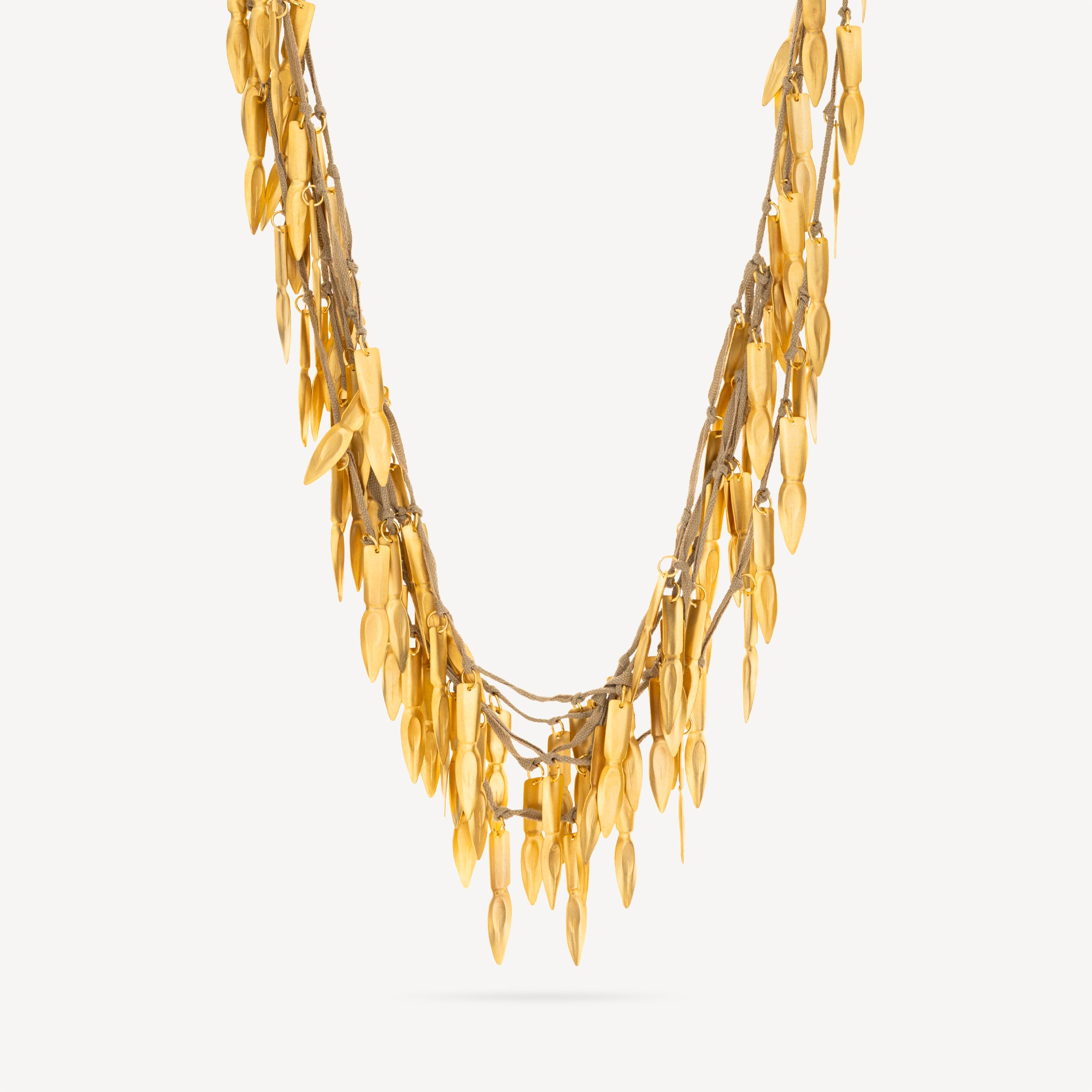 Collier sautoir monté sur un cordon taupe orné de feuilles métalliques dorées pour un look habillé et bohème. Fait main à Venise, Italie.
