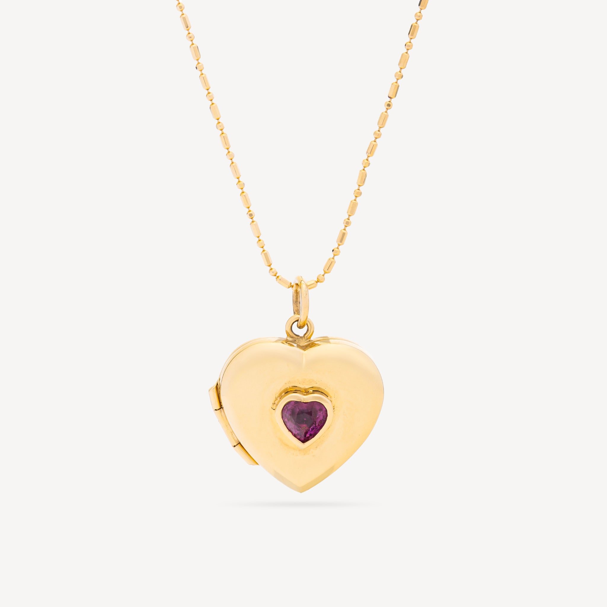 Le collier Lily Ruby Locket en or jaune 18 carats dispose d''un pendentif en forme de cœur sublimé par un rubis, également en forme de cœur. Le pendentif s'ouvre et révèle un espace idéal pour y plonger vos secrets. Le rubis stimule l’énergie du cœur, renforce le courage et inspire l’amour intense.
