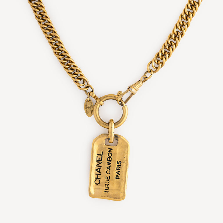 Collier chaîne vintage en métal finition dorée avec pendentif plaque “Chanel, 31 rue Cambon Paris”.
