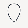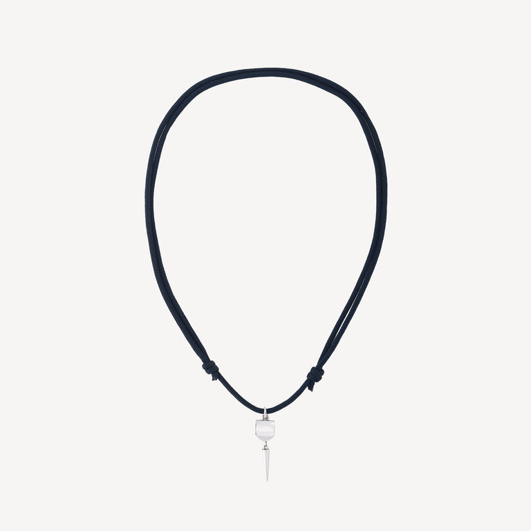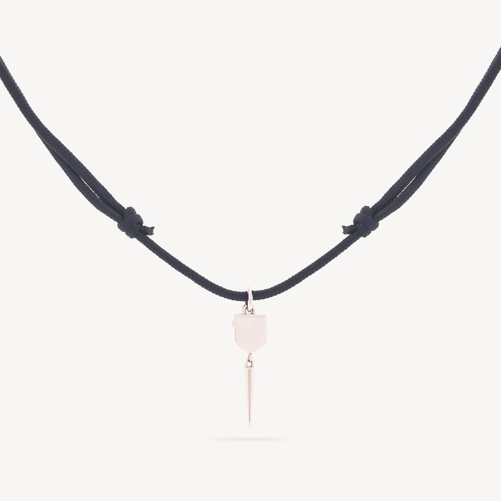 Collier monté sur un cordon noir orné d’un pendentif blason et du charm revolution en or blanc.