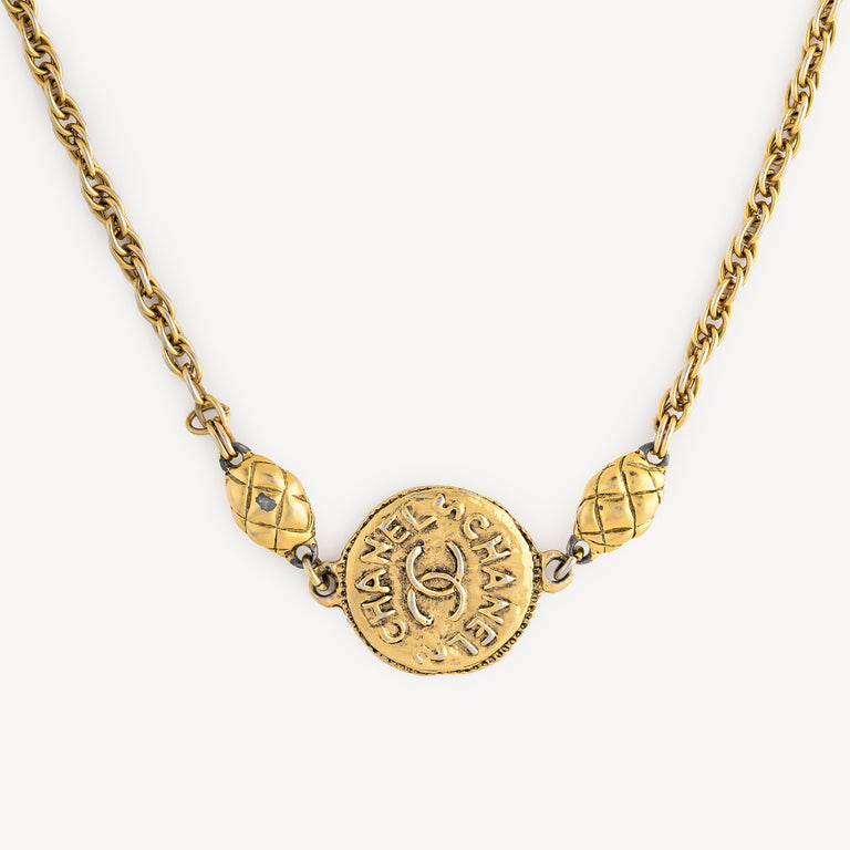 Collier sautoir vintage en métal finition dorée avec médaillon logo Chanel.