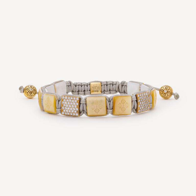Bracelet monté sur un cordon gris composé de : 9 locks en nacre double face jaune et blanche, 2 locks en or jaune pavés de diamants blancs, un lock en or jaune orné d’un diamant blanc, et 2 beads en or jaune ornées de diamants blancs.