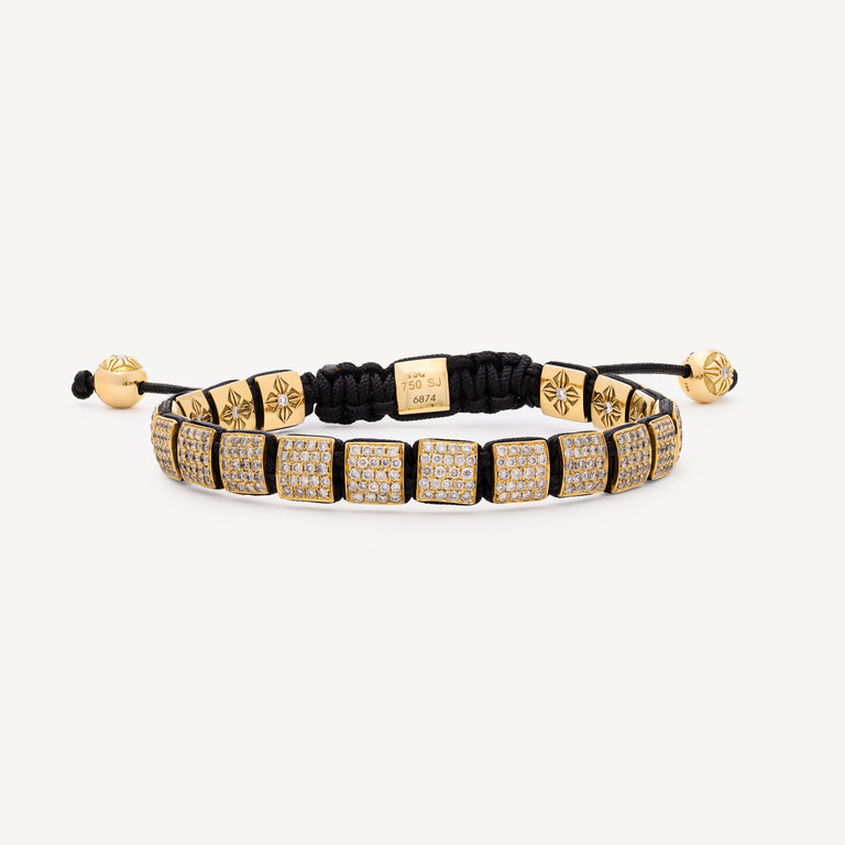 Bracelet monté sur un cordon noir composé de : 12 locks en or jaune pavés de diamants blancs, 6 locks en or jaune ornés de diamans blancs, un lock en or jaune orné d’un diamant blanc et 2 beads en or jaune ornés de diamants blancs.