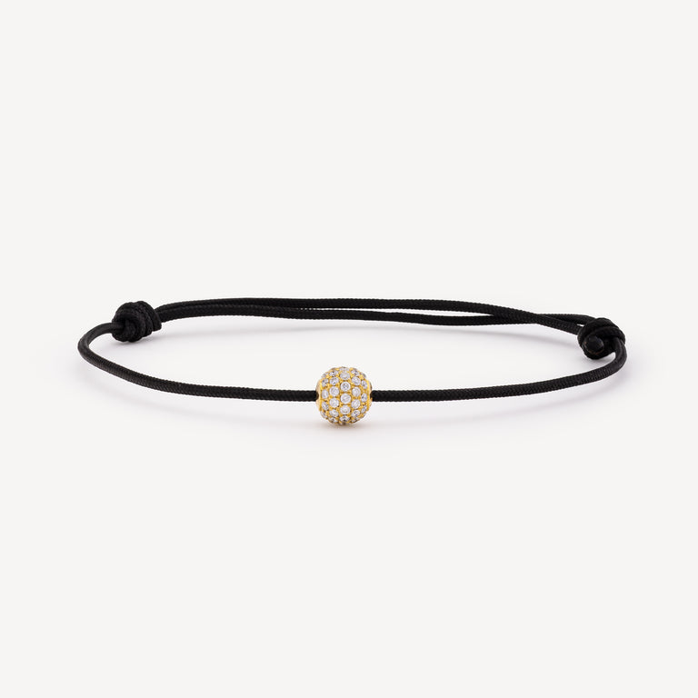 Bracelet monté sur un cordon noir composé d’une bead en or jaune pavée de diamants blancs.