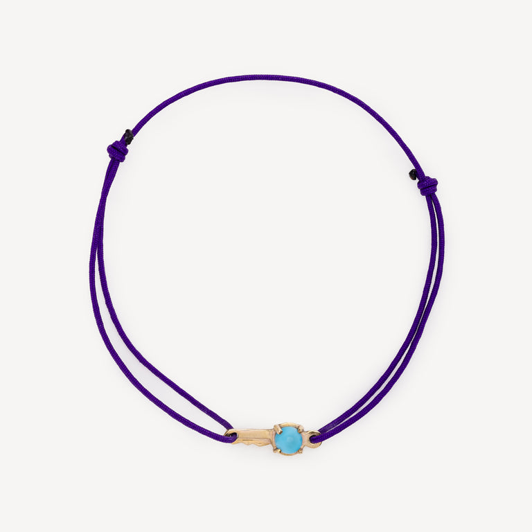 Bracelet clé en or jaune ornée d’une turquoise, monté sur un cordon violet.