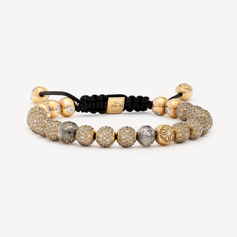 Bracelet monté sur un cordon noir composé de 25 beads en or jaune : 8 beads en or jaune serties de 2 diamants blancs, 15 beads en or jaune totalement pavées de diamants blancs, 2 beads de diamant brut.