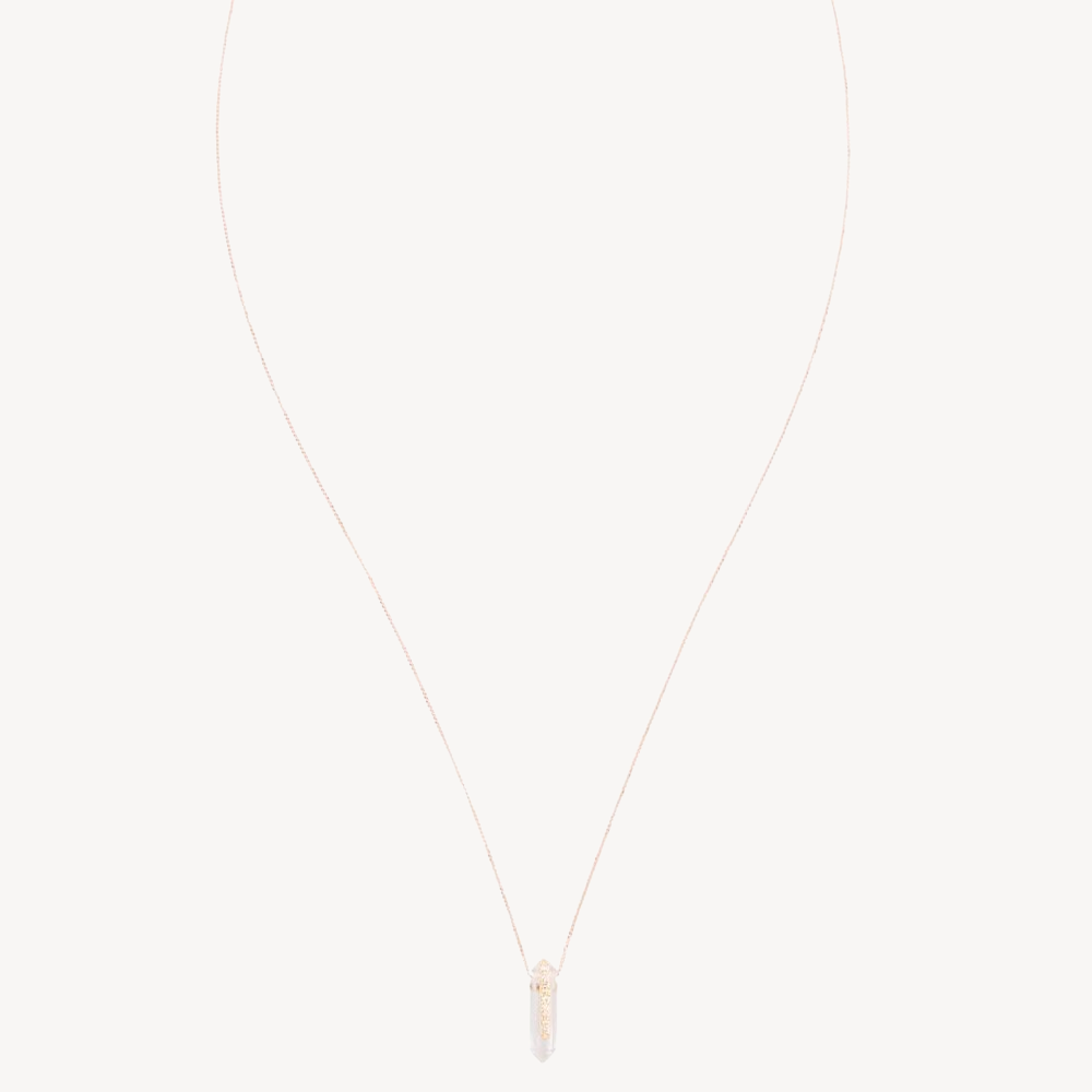 Animé par son pendentif en cristal de roche taillé et serti d'une barre verticale en or de 9 diamants, ce collier délicat en or rose vous rend belle. Un bijou féminin et sophistiqué pour un style qui sait se faire admirer.
