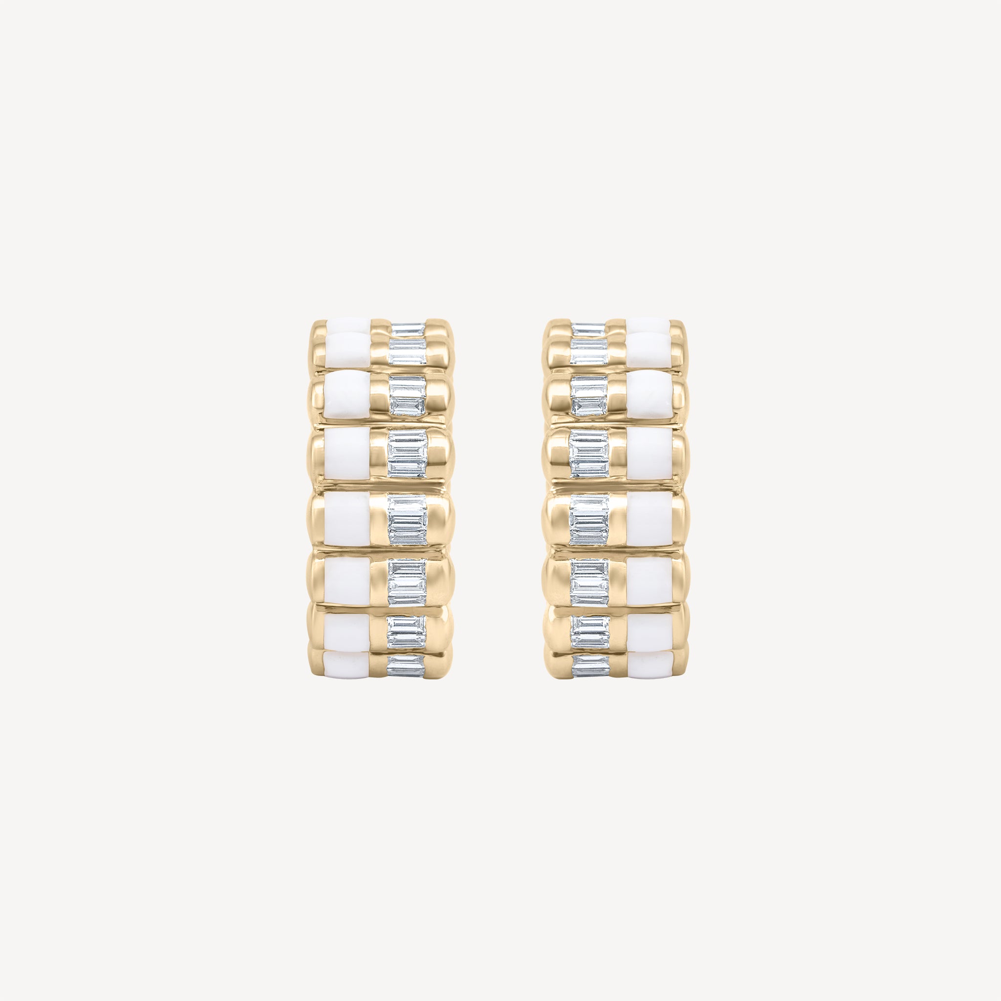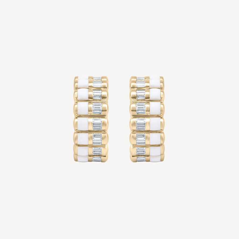 Les boucles d'oreilles City Glitz de Mirari célèbrent la pureté. Ornées d'un trait blanc en émail qui traverse délicatement chaque demie créole, elles sont rehaussées de diamants blancs scintillants qui amplifient leur éclat. Le diamant harmonise l’énergie et révèle la vérité intérieure.
