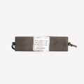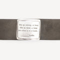 Bracelet en cuir gris avec plaque en argent gravé : “Celui qui interroge, se trompe. Celui qui répond, se trompe. Fais silence en toi et écoute… -Bouddha”