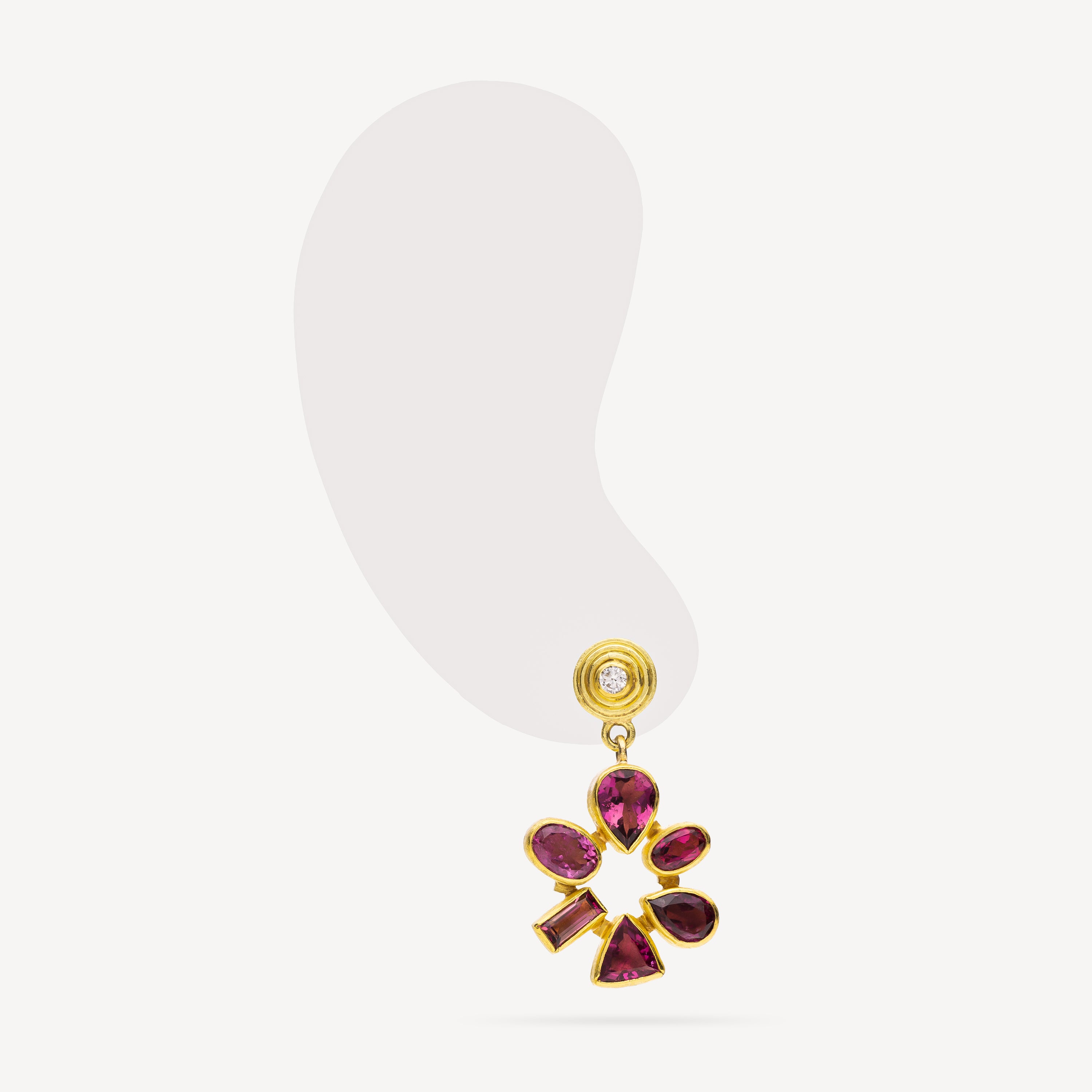 Ces élégantes boucles d'oreilles sont ornées de belles tourmalines rouges et conçues avec des motifs floraux en or jaune. Ajoutez une touche de couleur et de charme à votre tenue avec ces boucles d'oreilles uniques.