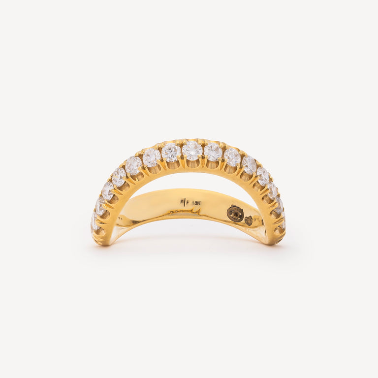 La bague Cosmic Wave en or jaune reflète l’univers visionnaire de Future Fortune, maison née au cœur de Los Angeles et inspirée par l’Art déco et l’esthétique rétro-futuriste. Ses lignes ondulantes, évoquant le mouvement d’une vague et l’énergie cosmique, enveloppent le doigt avec fluidité, tandis que son pavage de diamants blancs capte la lumière avec intensité. Véritable talisman moderne, ce bijou incarne la philosophie de la marque, avec un équilibre entre design, symbolisme et élégance contemporaine.