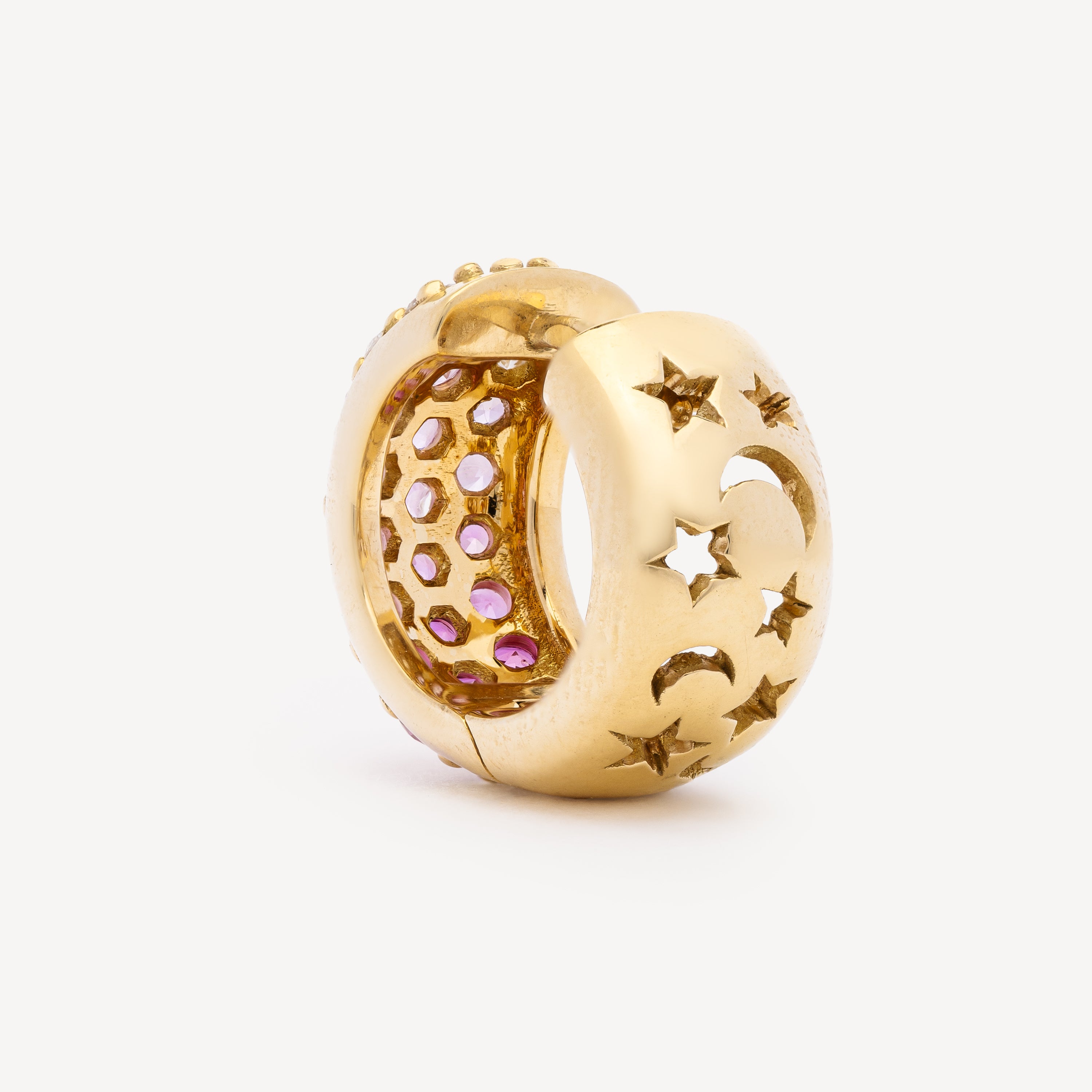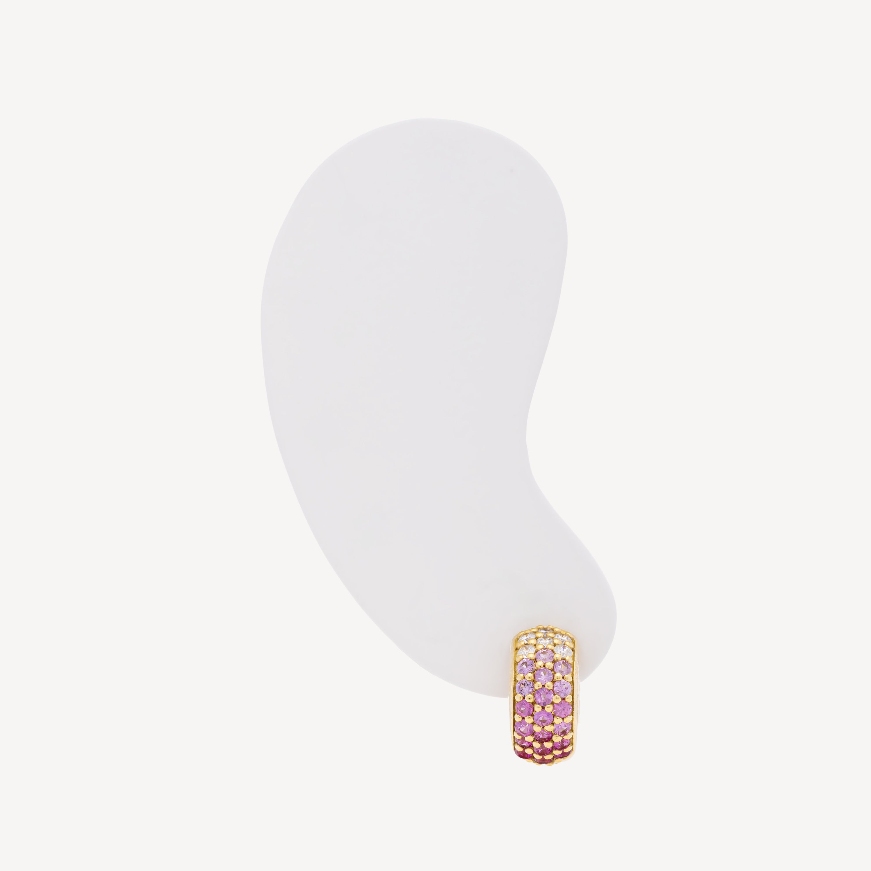 Cette paire de créoles est confectionnée en or jaune et est demi pavée de diamants dégradés rose.