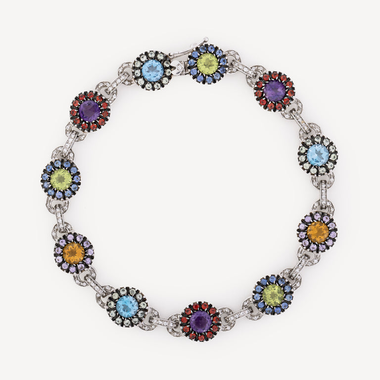 Bracelet en or blanc pavé de diamants et saphirs multicolores formant de magnifiques fleurs.
