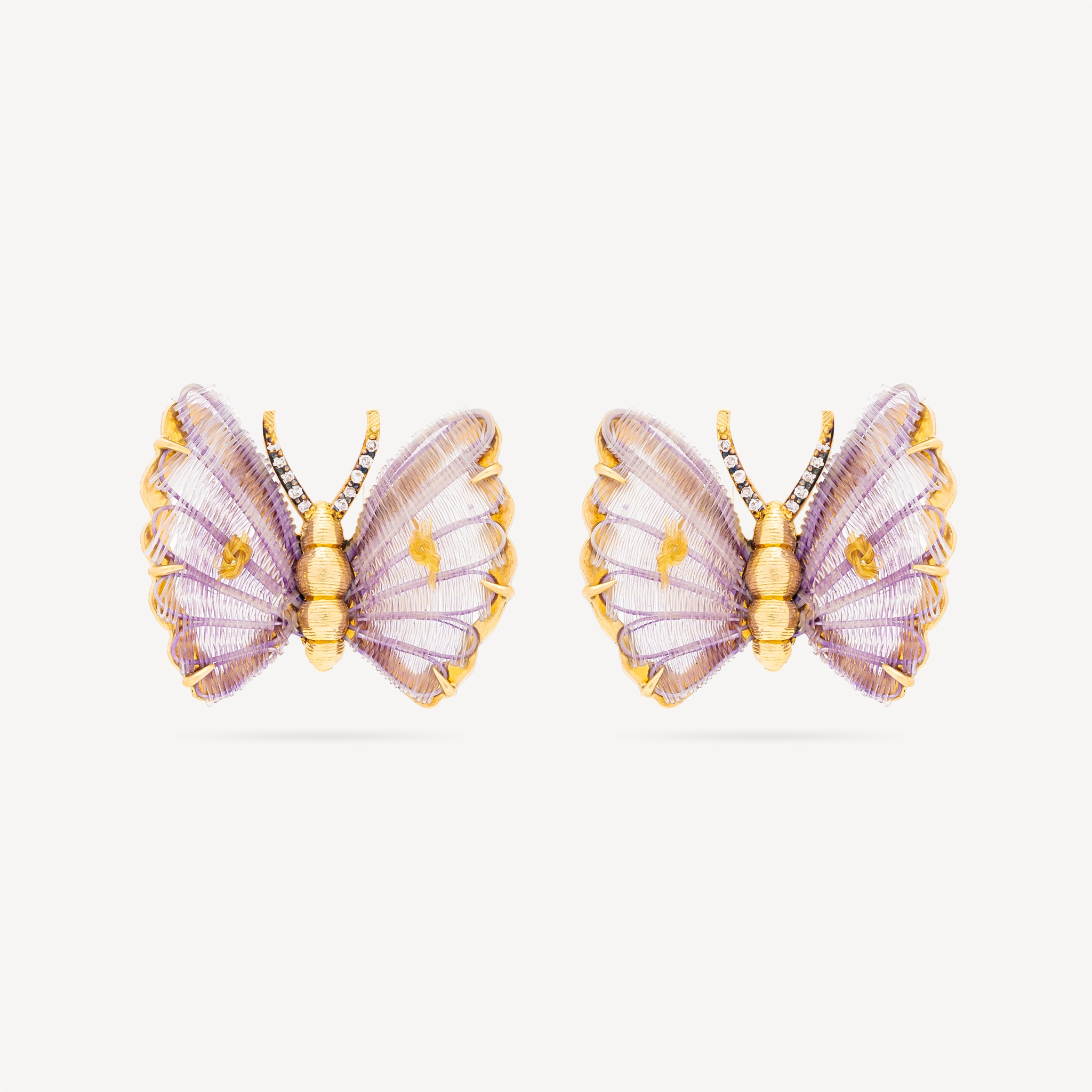 Silvia Furmanovich présente ces boucles d'oreilles Horse Mane Butterfly en or jaune ornées de diamants blancs. Ce design poétique capture l'essence du mouvement avec finesse, reflétant le prestige de la maison joaillière. Les diamants blancs, symboles de pureté et de clarté, sont réputés pour amplifier la lumière intérieure et favoriser la sérénité de celui qui les porte.