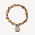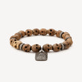 Bracelet élastique avec têtes de mort en bois, perles et charm en argent sertis de diamants blancs.