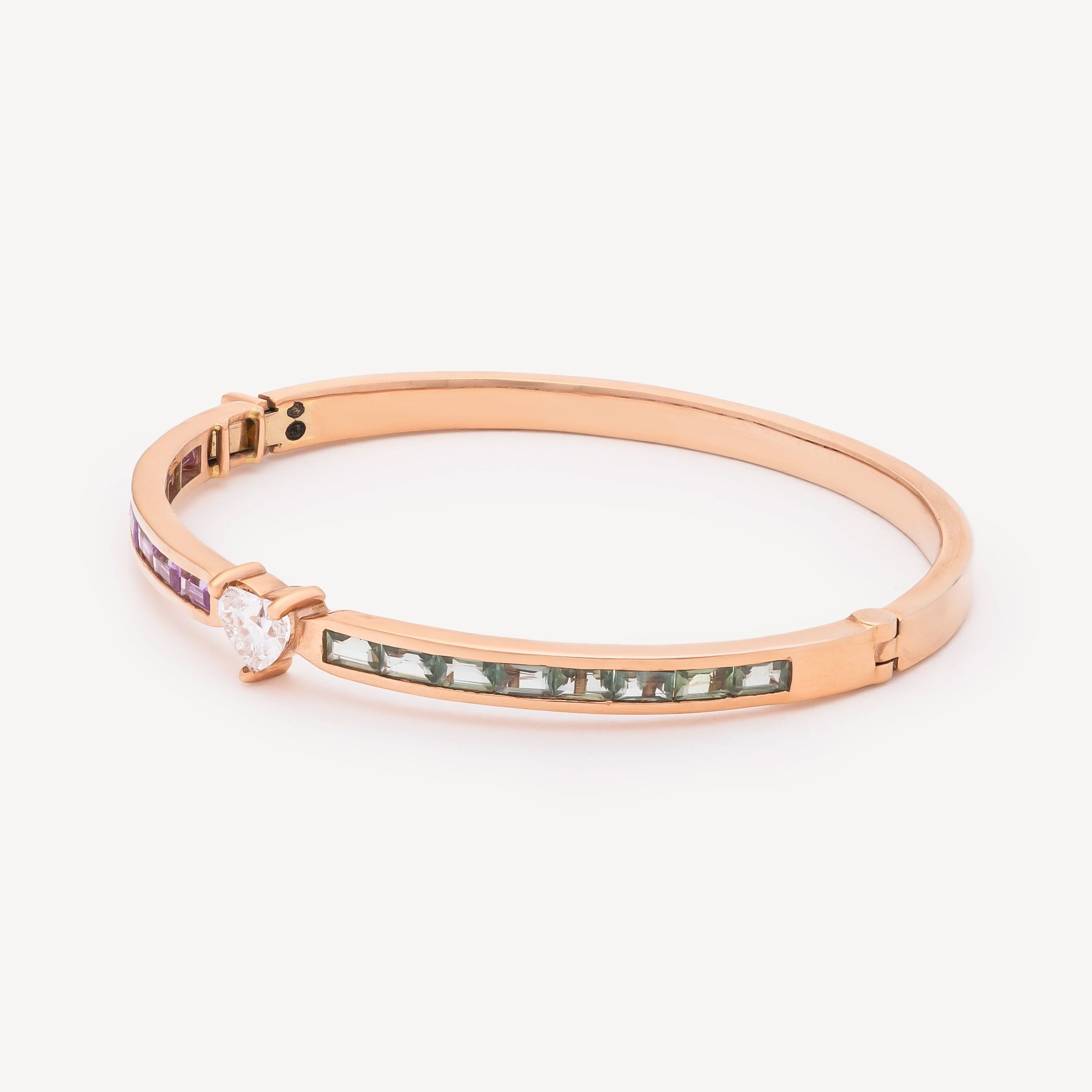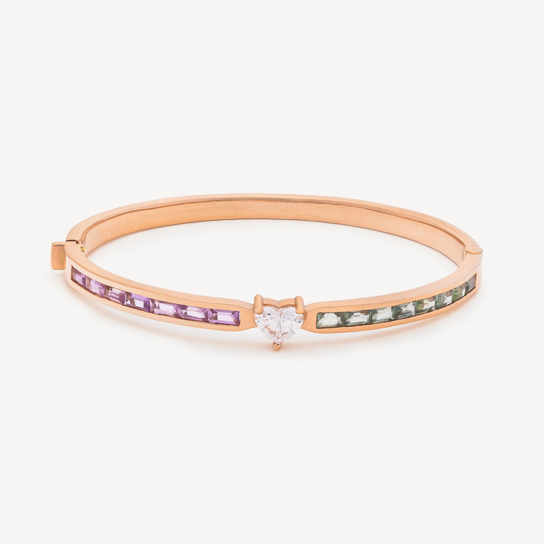 Le bracelet Prismatique révèle une vibration de couleurs rares, où le saphir rose et le saphir vert s’unissent dans un dégradé inattendu, illuminé par un diamant central. Sertie dans l’or rose, cette pièce joue sur la tension entre douceur et éclat, équilibre et mystère. Fidèle à l’esprit Tanka & Baroque, elle évoque une beauté intuitive, presque mystique, sculptée dans la lumière. Le saphir rose favorise l’amour sincère et la compassion, tandis que le saphir vert ouvre la voie à la croissance et à la sérénité. Le diamant, lui, amplifie ces énergies de clarté et d’alignement intérieur, un talisman de cœur et d’esprit pour les âmes sensibles et fortes.