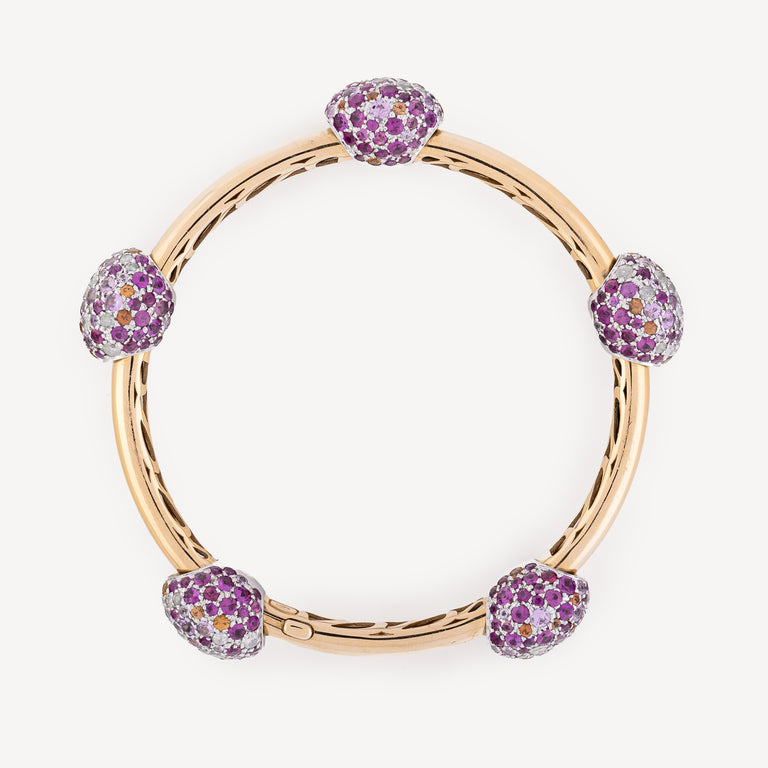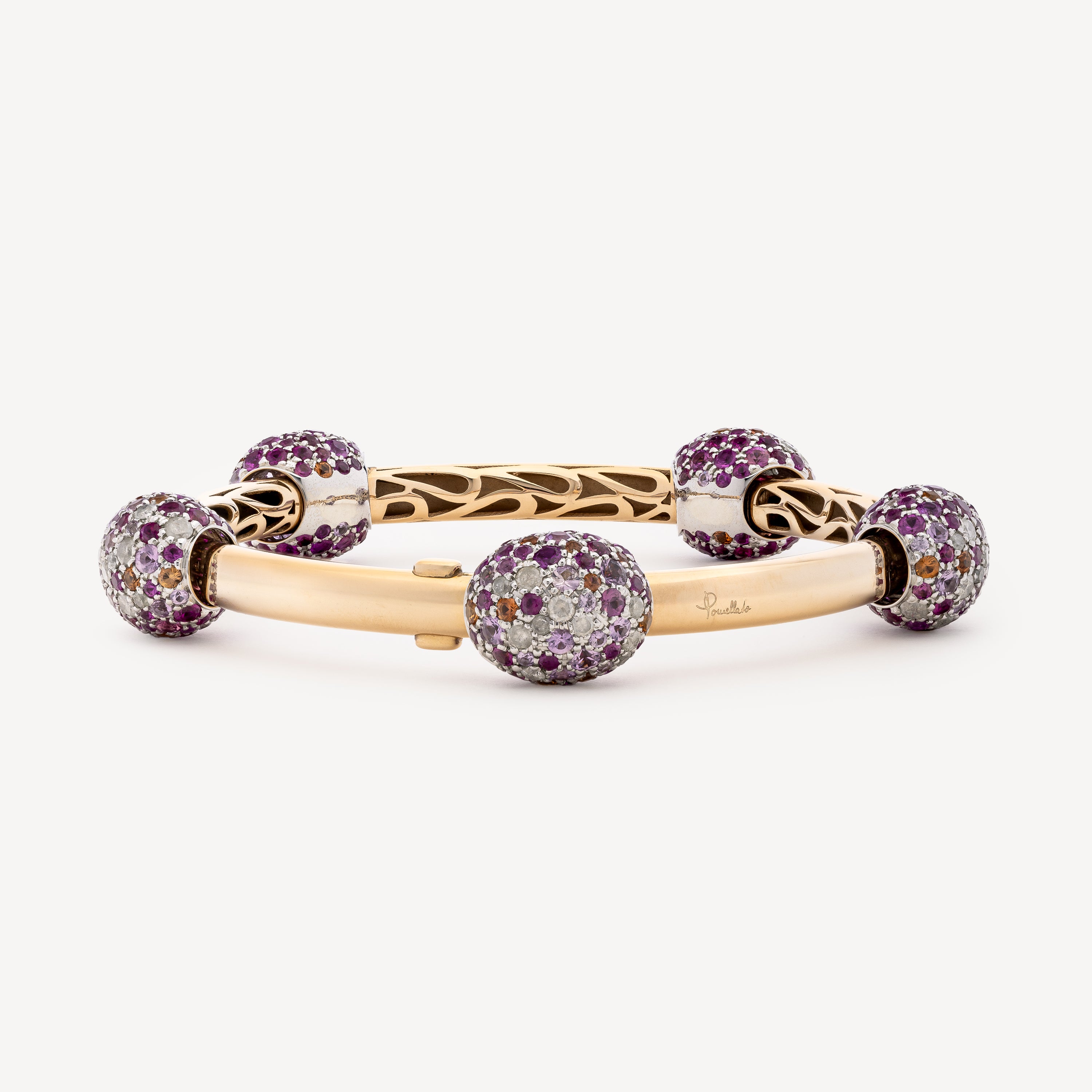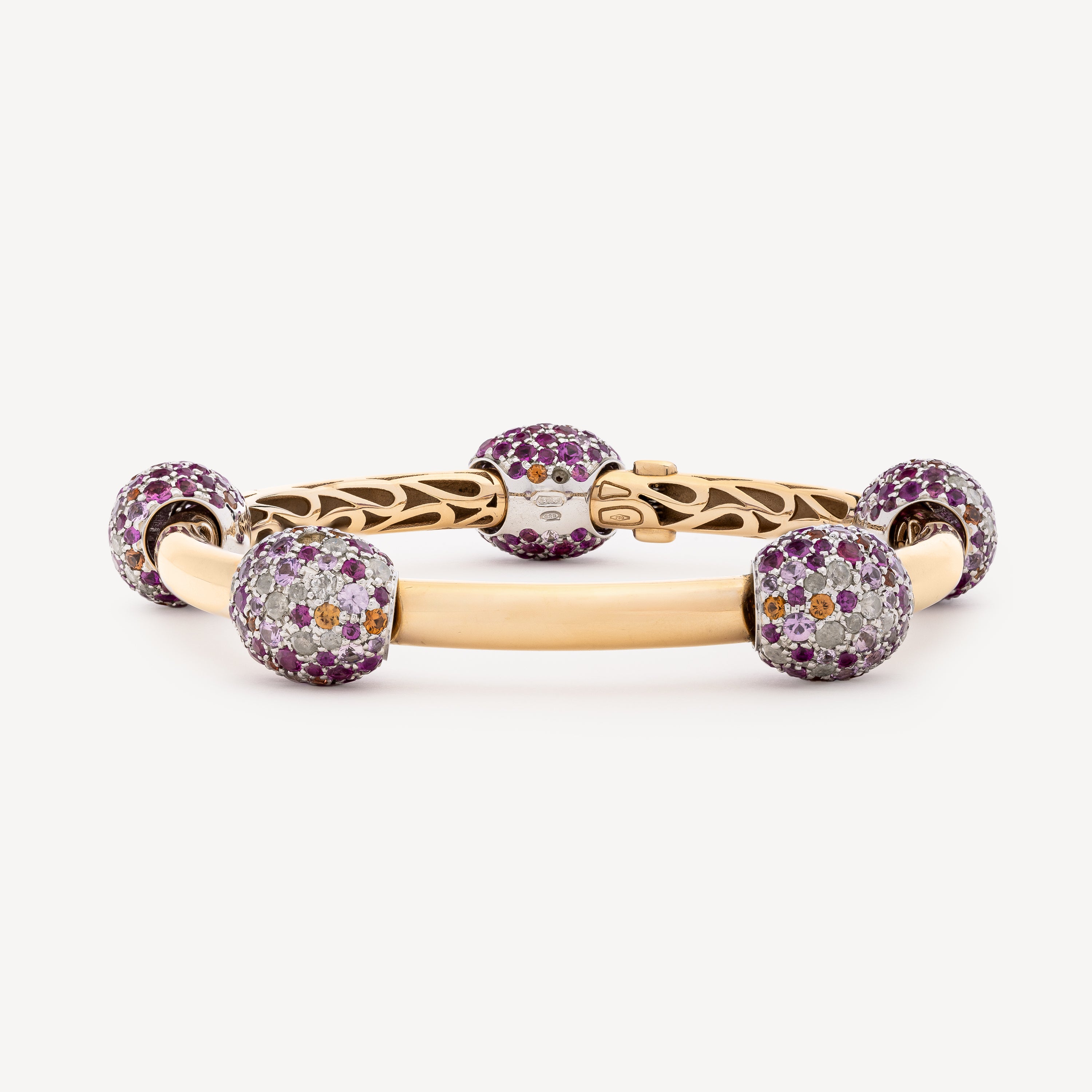 Magnifique bracelet en or jaune 18ct avec 5 beads pavées de diamants blancs et de saphirs roses et oranges.