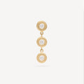 Boucle d'oreille élégante avec trois petits diamants taillés en brillant. Chaque diamant est entouré d'un cercle d'or à la surface cannelée et profilée à la main. La surface texturée de l'or donne une vie particulière à la réflexion de la lumière des diamants.