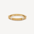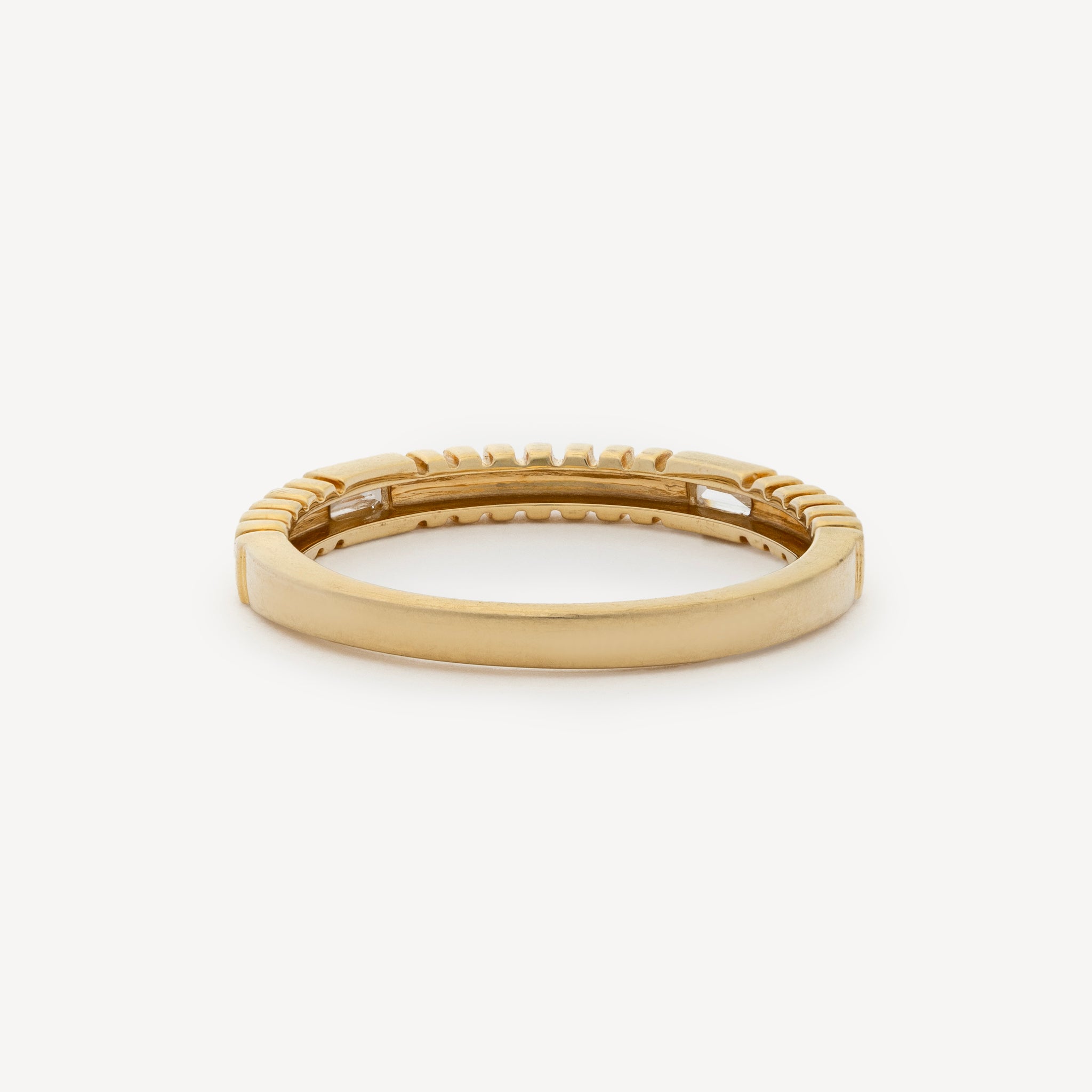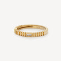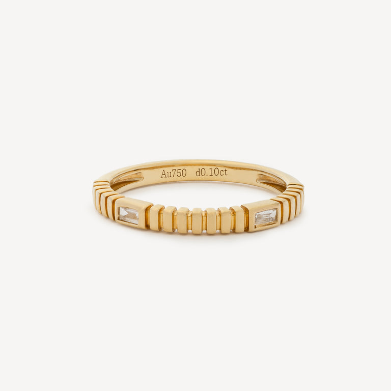Bague en or jaune motif entailles ornée de deux diamants blancs taille baguette. Symbole de pureté et de force, le diamant blanc illumine l’esprit et amplifie les énergies positives. Vendue avec certificat GRC.