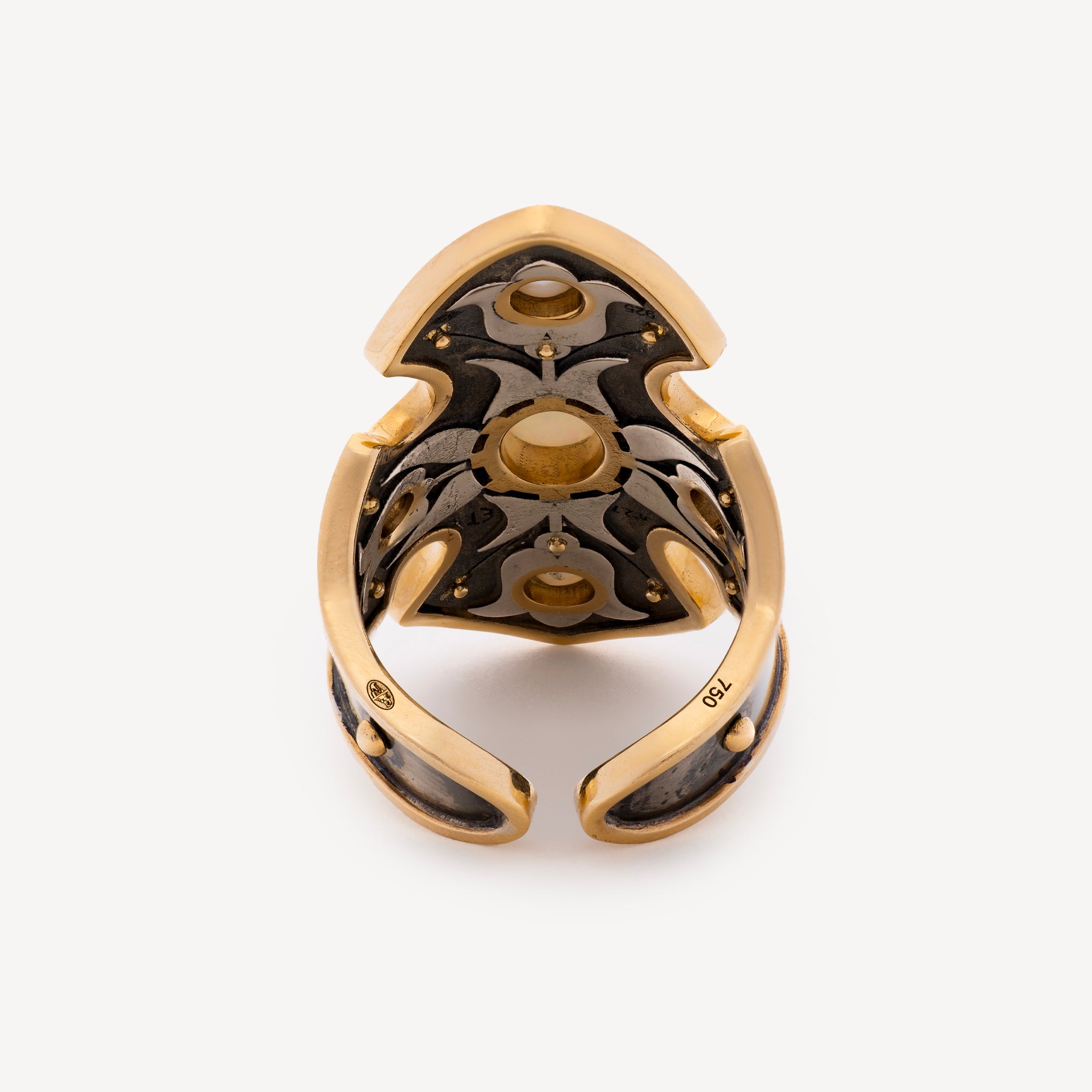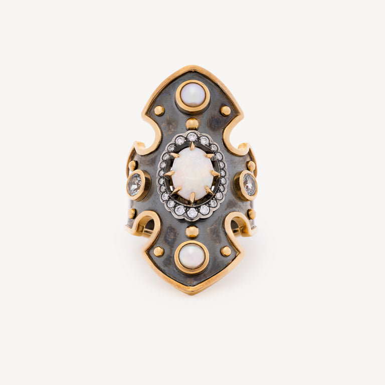 Cette bague bouclier signée Elie Top captive par son ornement de pierres précieuses. Entourée de diamants blancs, de perles akoya et de saphirs blancs délicatement sertis et d'une opale en son centre, cette création allie la noblesse des pierres à un design architectural distinctif. L’opale éveille créativité et inspiration, entourée de diamants pour la clarté, de perles Akoya pour la douceur, et de saphirs blancs pour la sérénité.