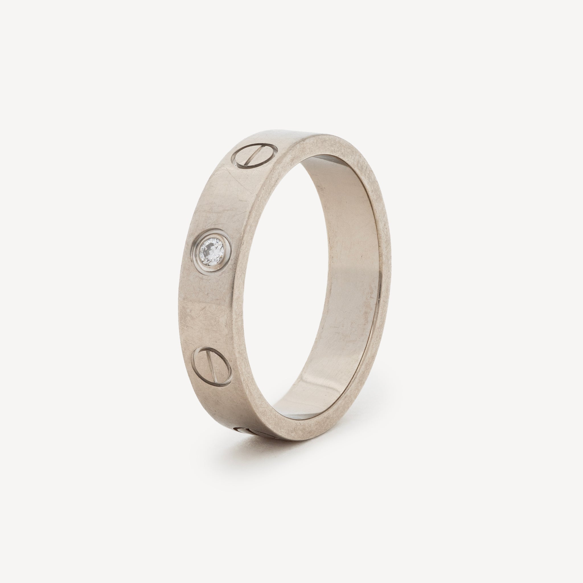 Bague Love iconique de Cartier, petit modèle, ornée d’un diamant blanc. Symbole de pureté et de force, le diamant blanc illumine l’esprit et amplifie les énergies positives.