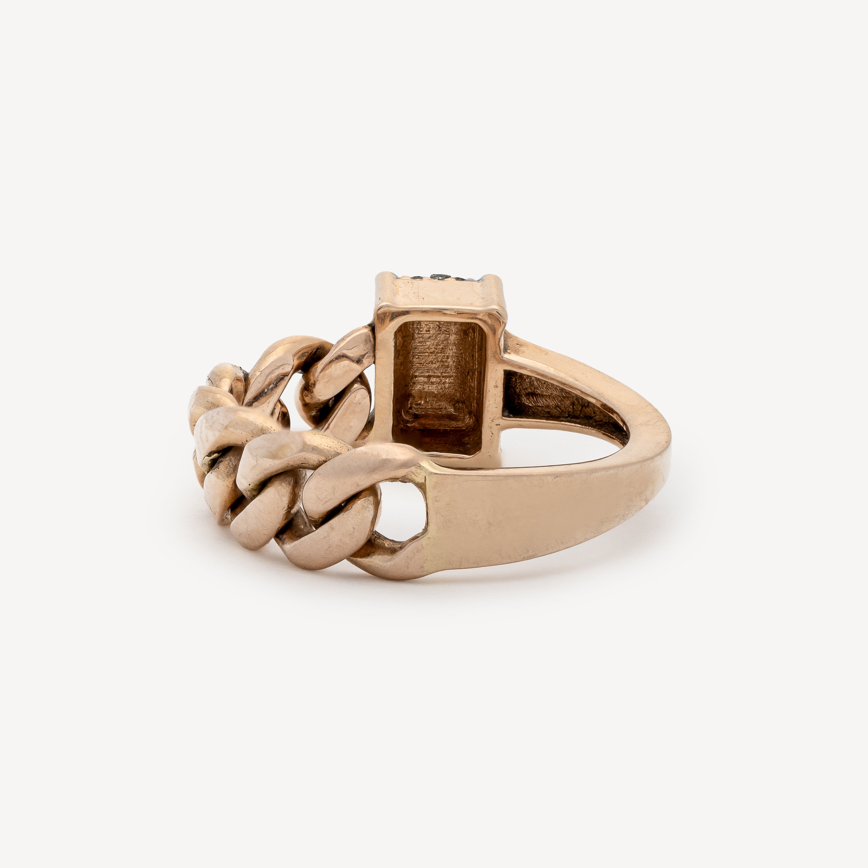 Rose gold half-ring, half-chain ring, with central rectangle paved with white diamonds.
