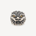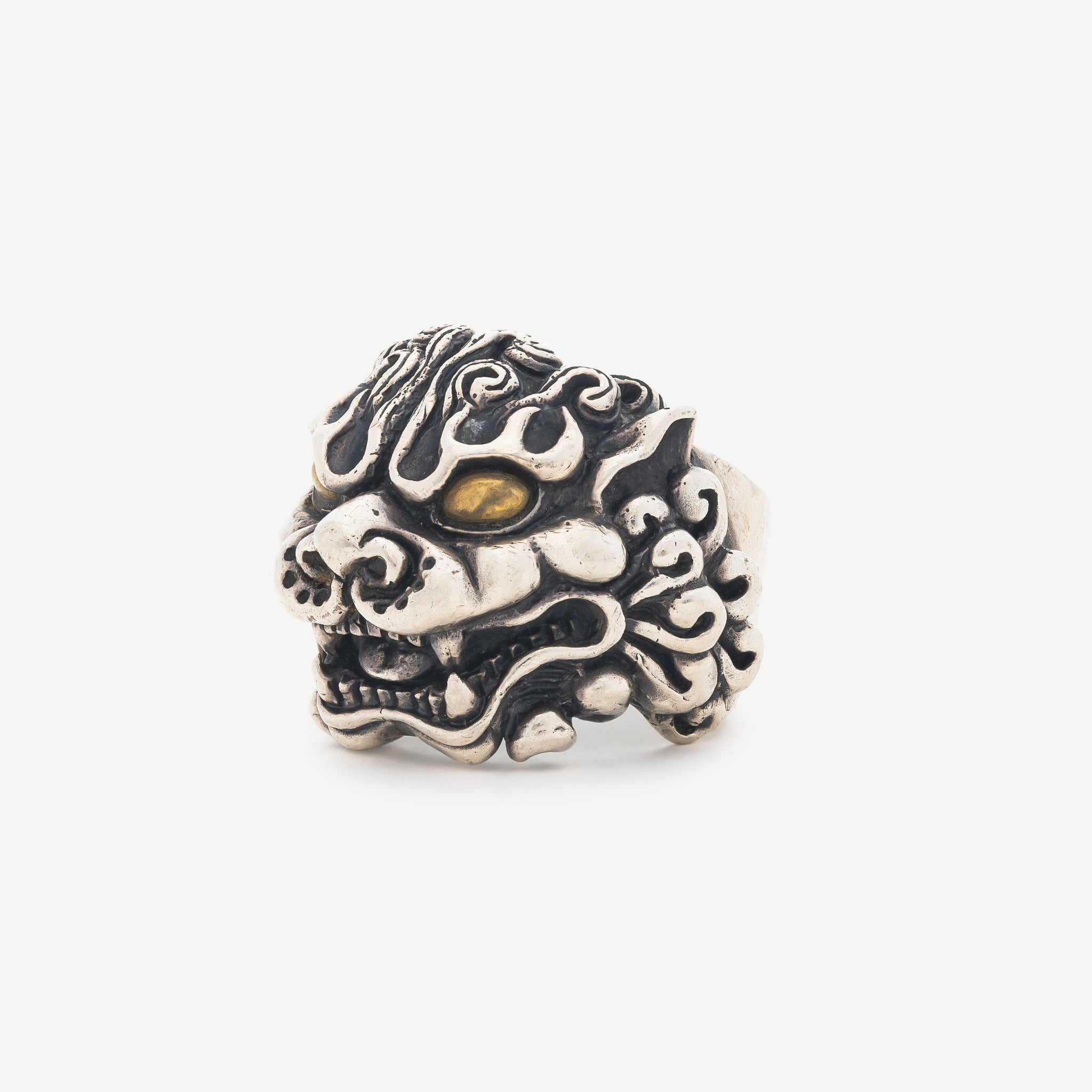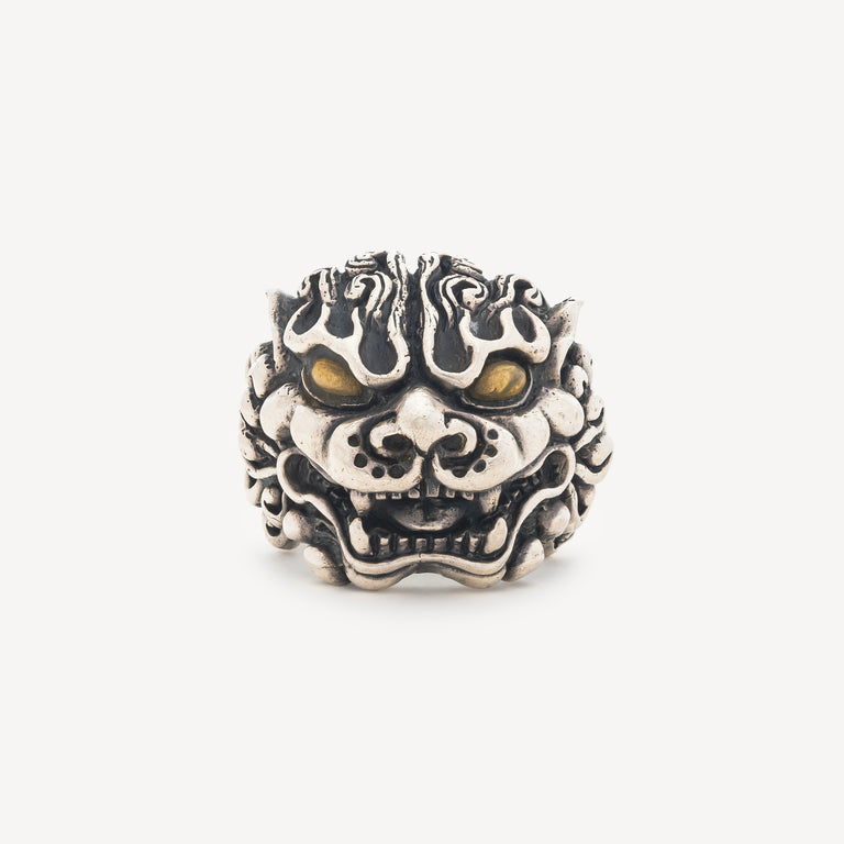 Bague imposante mettant en scène une tête de lion magistrale en argent. Le travail de ciselure révèle chaque détail avec précision, tandis que les yeux rehaussés de dorure confèrent une intensité captivante à cette pièce. Son épaisseur généreuse garantit une présence affirmée et une durabilité exceptionnelle, incarnant force et prestige intemporels.