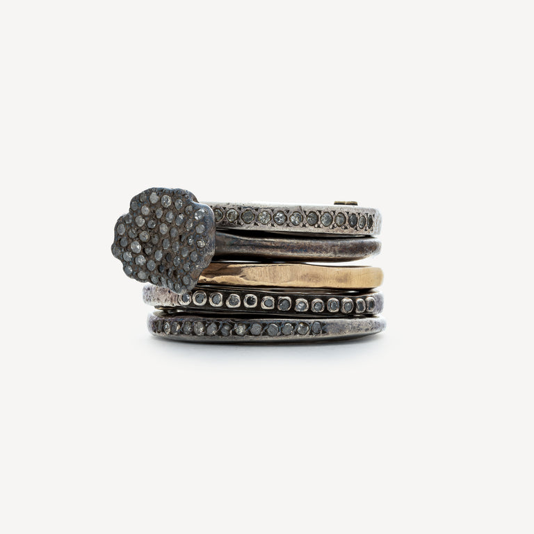 Oxidized silver ring composed of four rings: two simple hammered rings, a diamond-paved ring, and a ring with a diamond-paved centerpiece.