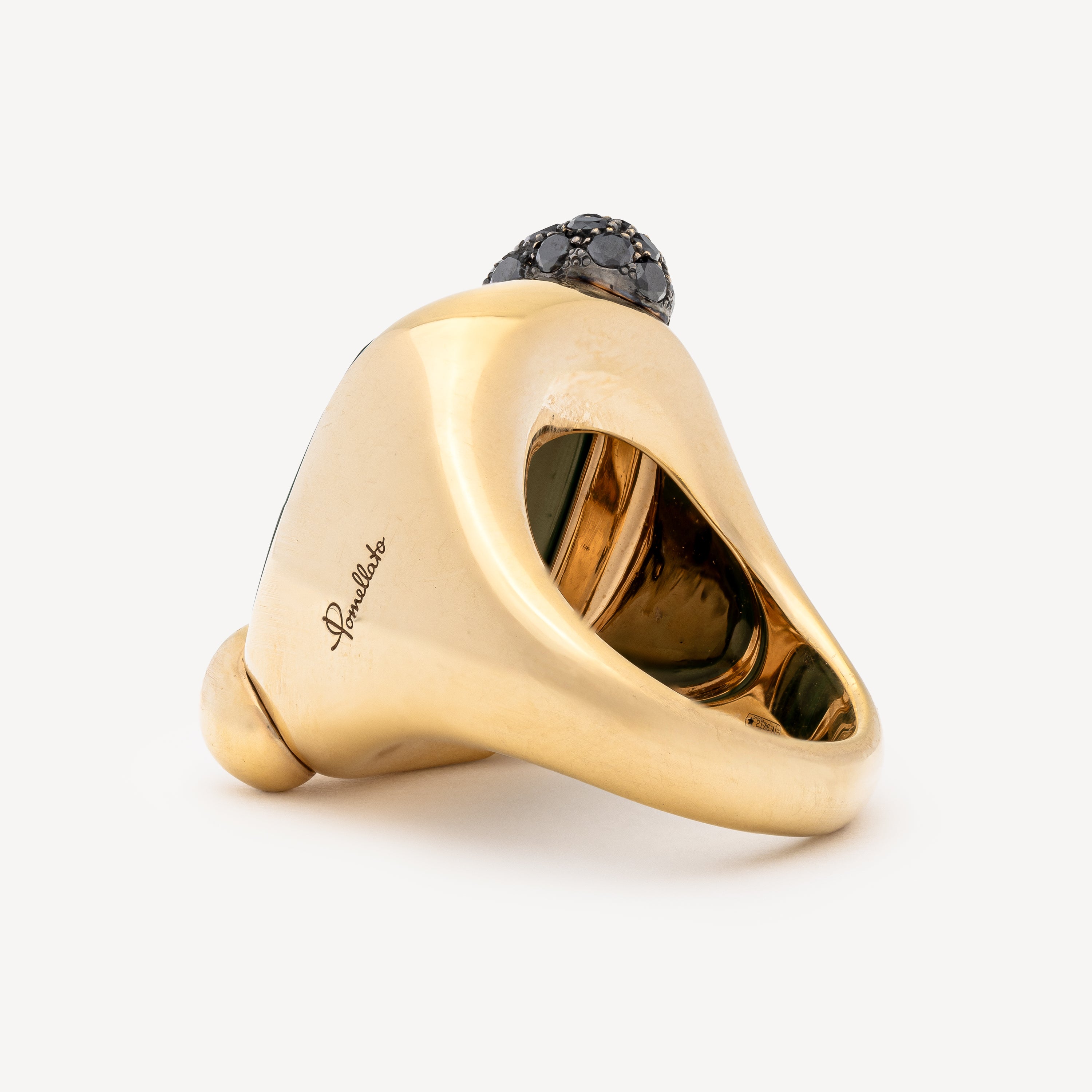 Medium yellow gold ring adorned with a central malachite and a claw paved with black diamonds.