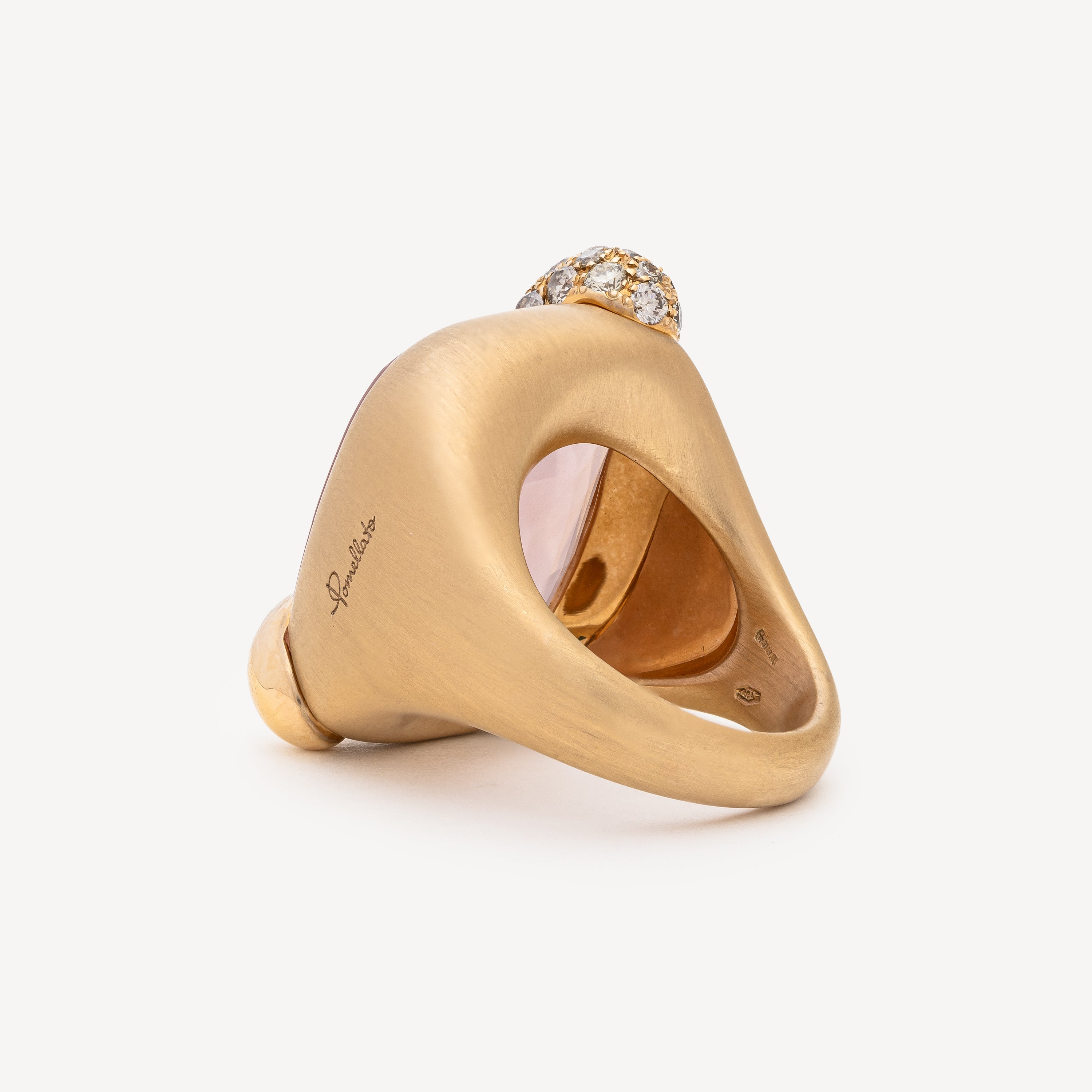 Medium yellow gold ring adorned with a central rose quartz and a claw paved with white diamonds.