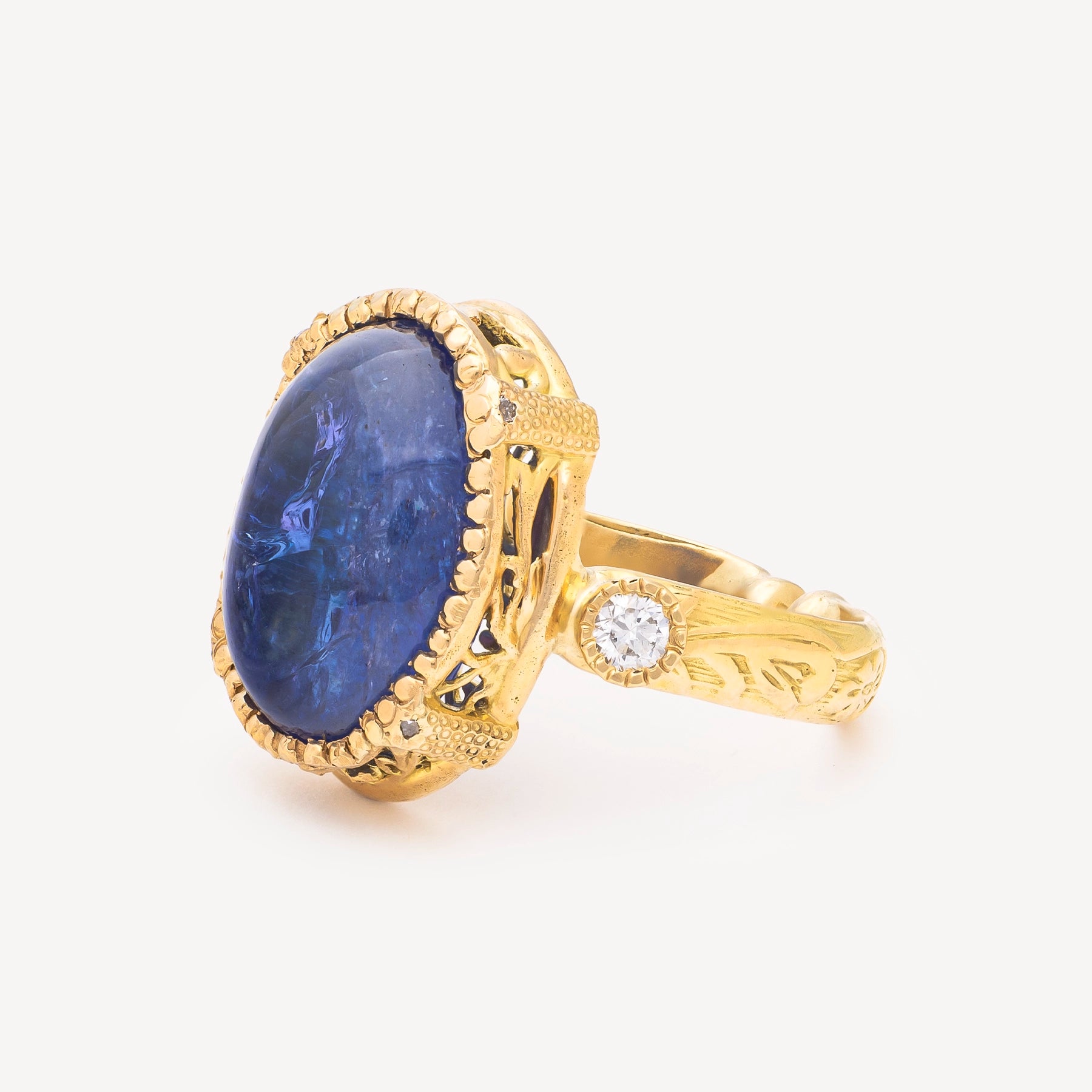 La bague Royal Tanzanite Diamant de Temple Jewel Ibiza raconte l’histoire d’une île où l’artisanat ancestral rencontre l’esprit libre de la Méditerranée. Chaque création reflète l’énergie vibrante d’Ibiza, entre lumière, couleur et symbolisme. Sculptée en or jaune, cette bague met en valeur une tanzanite centrale, pierre de clarté et d’harmonie, entourée de diamants étincelants qui en soulignent la majesté. Une pièce puissante, incarnant l’élégance intemporelle et le savoir-faire artisanal de la maison.