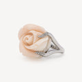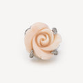 Pink ring in white gold and angel skin coral, adorned with white diamonds.