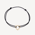 Bracelet with yellow gold triangle paved with white diamonds mounted on a black cord.
